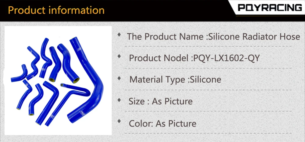 Рабочая температура: -60 ~ 260 градусовРабочая Давление: 0,3 для 0.9MpaДавление разрыва: 2 МПаТолщина: 4 мм, 3 слояРазмеры Допуск по уровню поверхности: +/-0,5 ммВысококачественный набор силиконовых шланговЦвет:Синий (снаружи) и желтый (внутри)Посылка включает в себя:10Набор силиконовых шлангов, как показано на рисунке.(Логотип PQY)