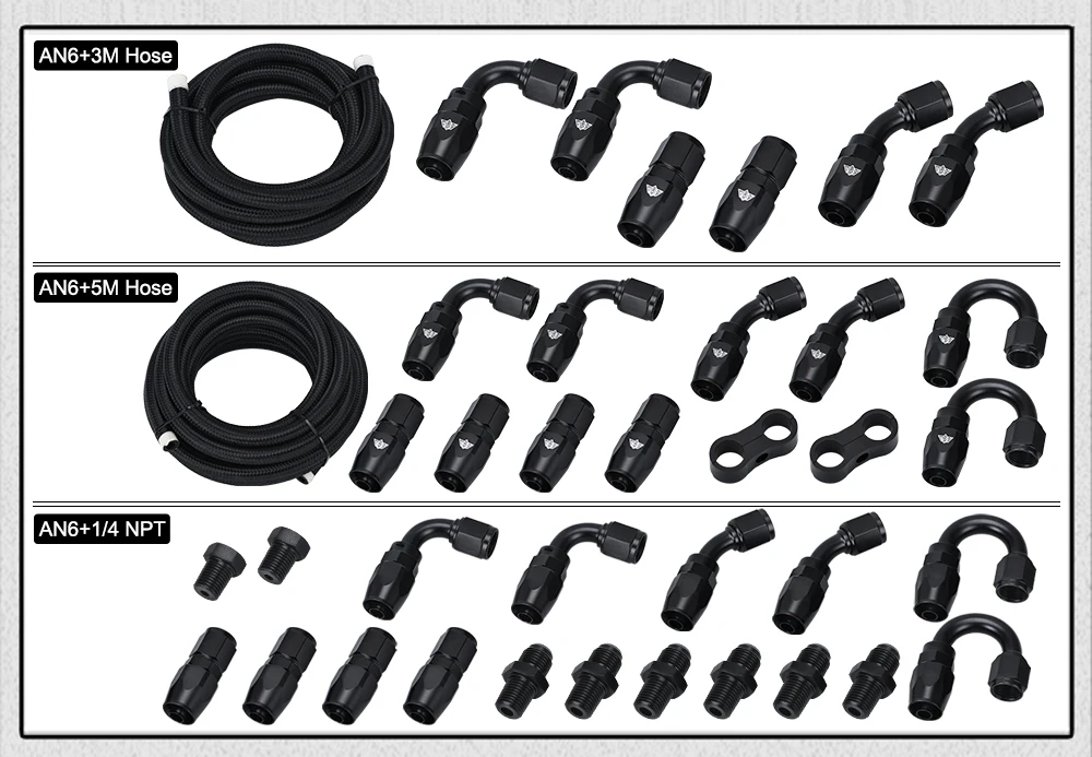 2 x AN6 прямой многоразовый поворотный конец шланга.2 x AN6 45 градусов многоразовый поворотный конец шланга.2 x AN6 90 градусов многоразовый поворотный конец шланга.3 метра x AN6 плетеный шланг. (100% абсолютно новый никогда не использовался или не установлен)