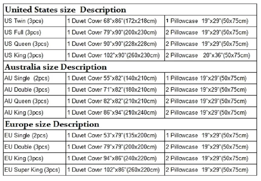 Packing List: 1* Duvet Cover + 1/2* Pillow Cases(product does not include any quilt or blanket)