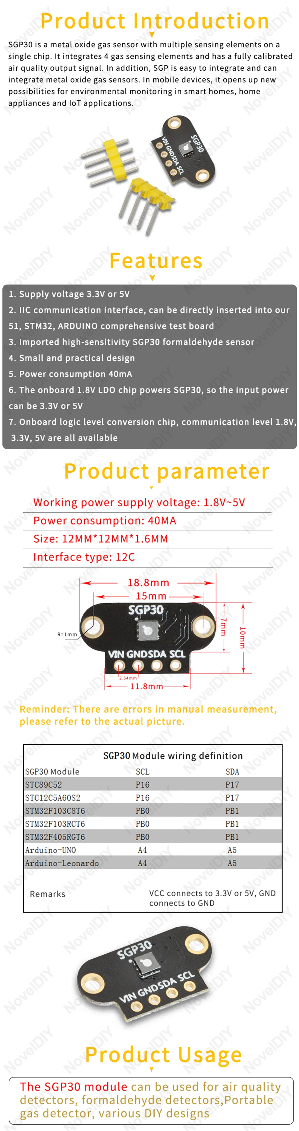 SGP30-это датчик оксида металла с несколькими Чувствительными элементами на одном чипе. Он интегрирован с четырьмя газовыми Чувствительными элементами и имеет полностью откалиброванный выходной сигнал качества воздуха. Кроме того, SGP легко интегрируется и может интегрировать датчики оксида металла в мобильные устройства, открывая новые возможности для экологического мониторинга в умных домах, бытовой технике и Интернет-приложений.