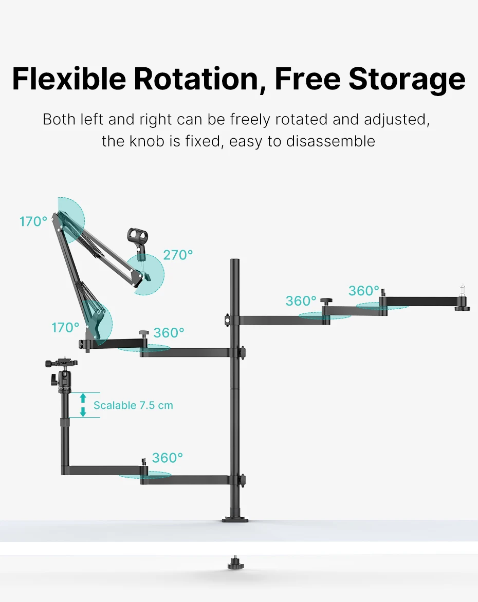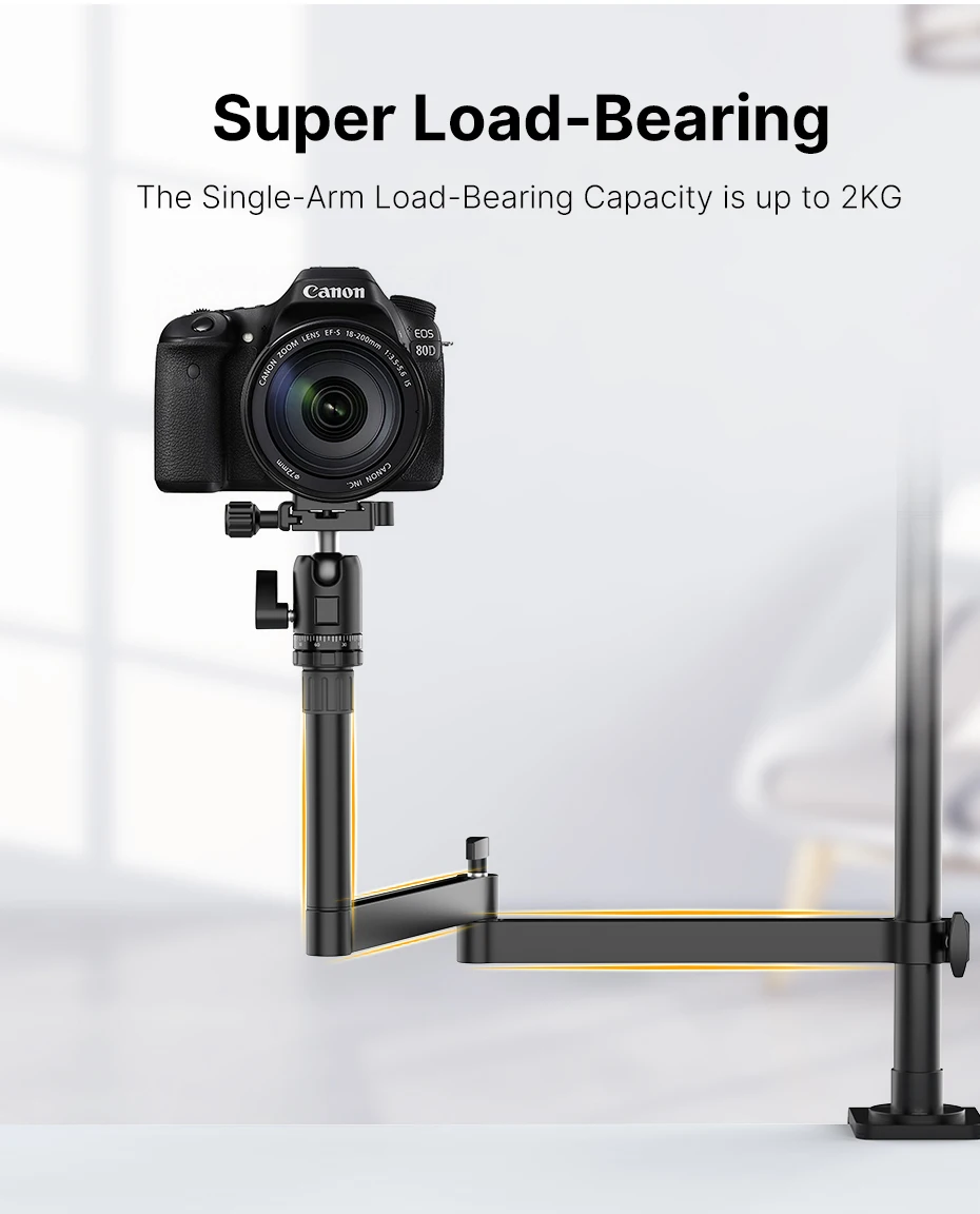 5. 【Супер нагрузка-Bearing】: благодаря увеличенному зажиму и более Толстому диаметру трубы, несущая способность одной руки составляет до 2 кг. Авиационный материал из алюминиевого сплава. Гибкое вращение, свободное хранение.