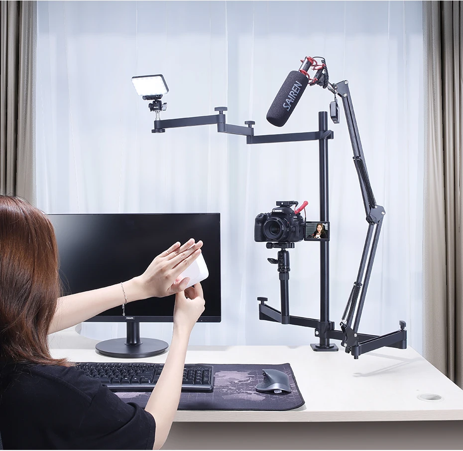 1. 【Профессиональный режим прямого эфира 】: превратите столешницу в профессиональную комнату прямого эфира за считанные секунды. Трехрычажный дизайн, камера, микрофон, заполняющий светильник может быть установлен одновременно, и жилая комната может быть изменена за считанные секунды.