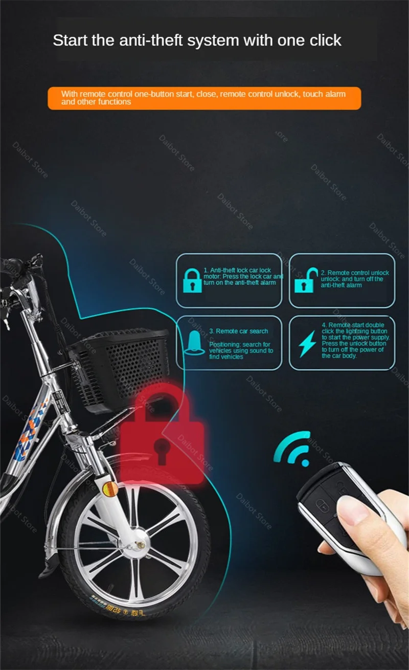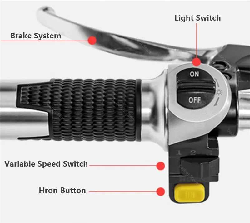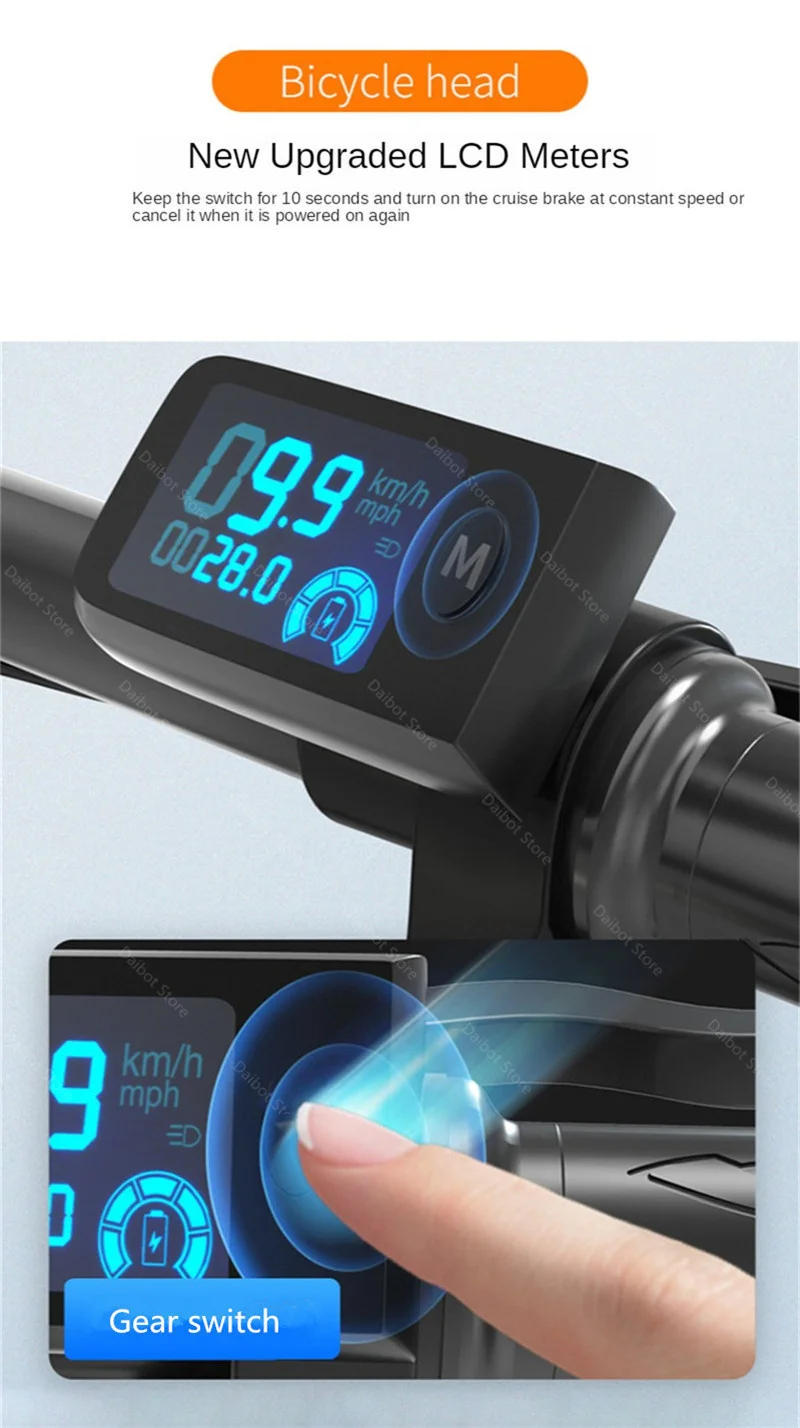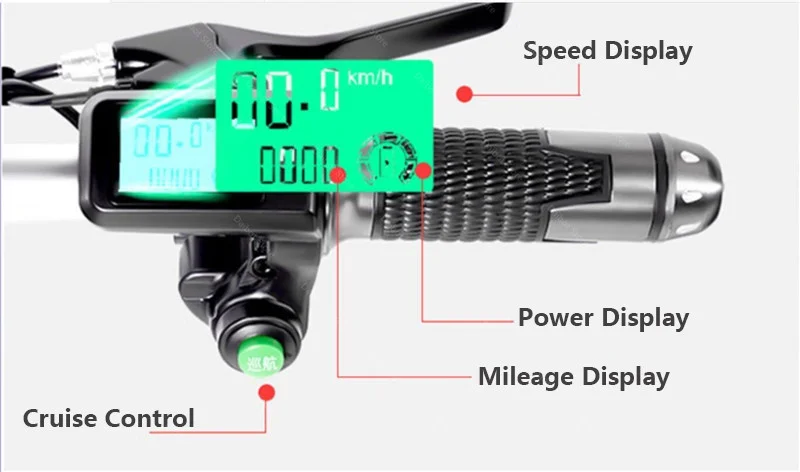 Feature: Cruise Control, Front and Rear Shock Suspension, Rear Hydraulic Brake, LCD Display, Horn, LED Headlight, Rear Taillight, Removable Battery, Anti-theft Alarm System, Mobile Phone Holder, Three Speed Gears, Two Charging Modes, Twist Throttle Handle, Three Riding Modes.