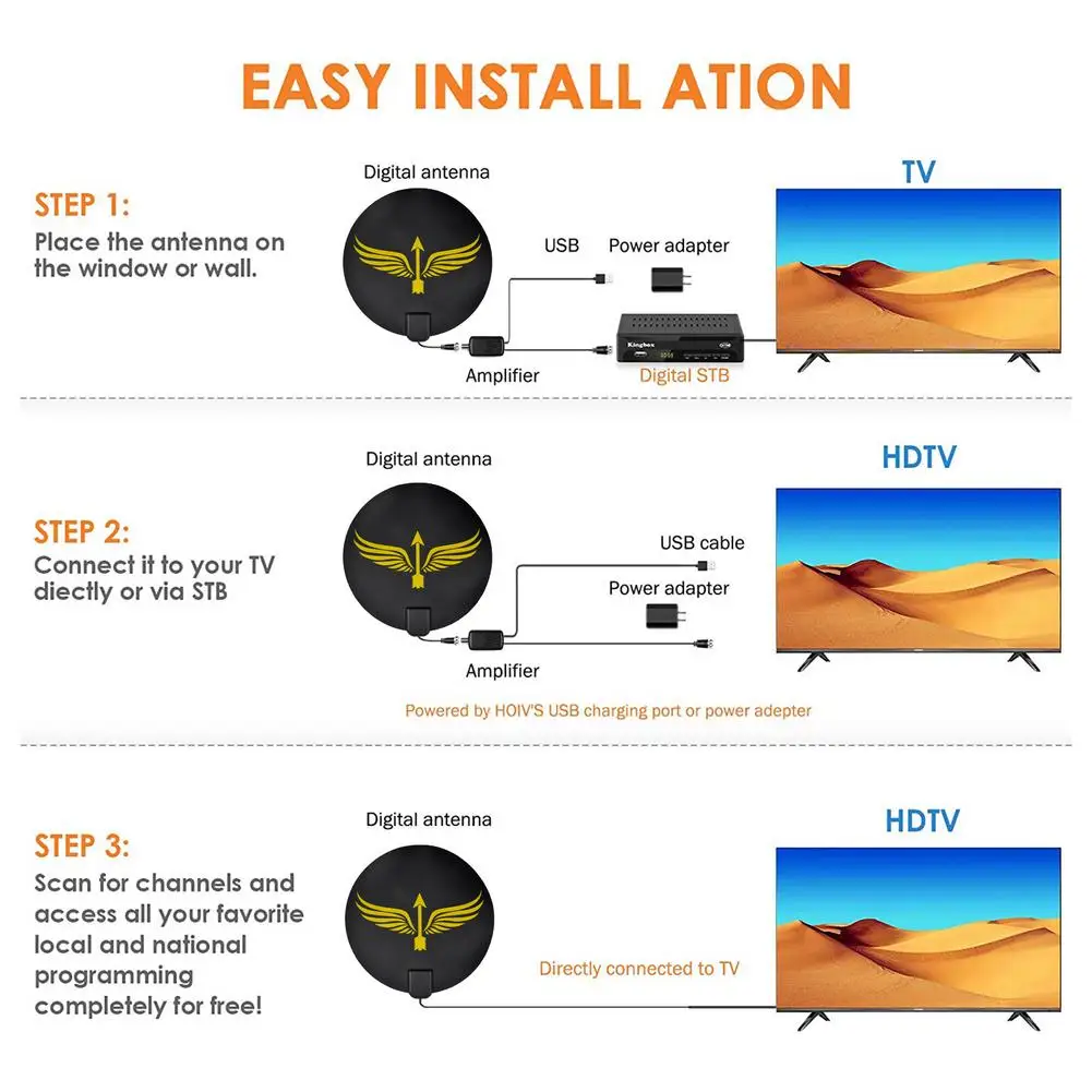 1,4 K Full HD канал: HDTV антенна позволяет экономить Кабельные сборы, не отказываясь от ваших любимых HD каналов! Извлеките все беспроводные программы в своей области и предоставьте 4K каналы бесплатно, такие как каналы для ABC, для CBS, для NBC, для PBC, для Fox и т. д. Эти усиленные антенны для внутреннего и наружного ТВ начинают получать доступ ко всем новостям, sitcoms, детским и спортивным вещам!