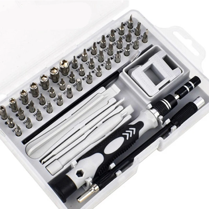 1 * ручка, 1 * Жесткий удлинитель, 1 * Мягкий удлинитель, 1 * пинцет, 1 * держатель ящика, 1 * штифт, 1 * магнетизатор/размагничиватель, 1 * присоска, 6 * тройной agnle picks, 3 * spudgers, 98 * отвертка Биты