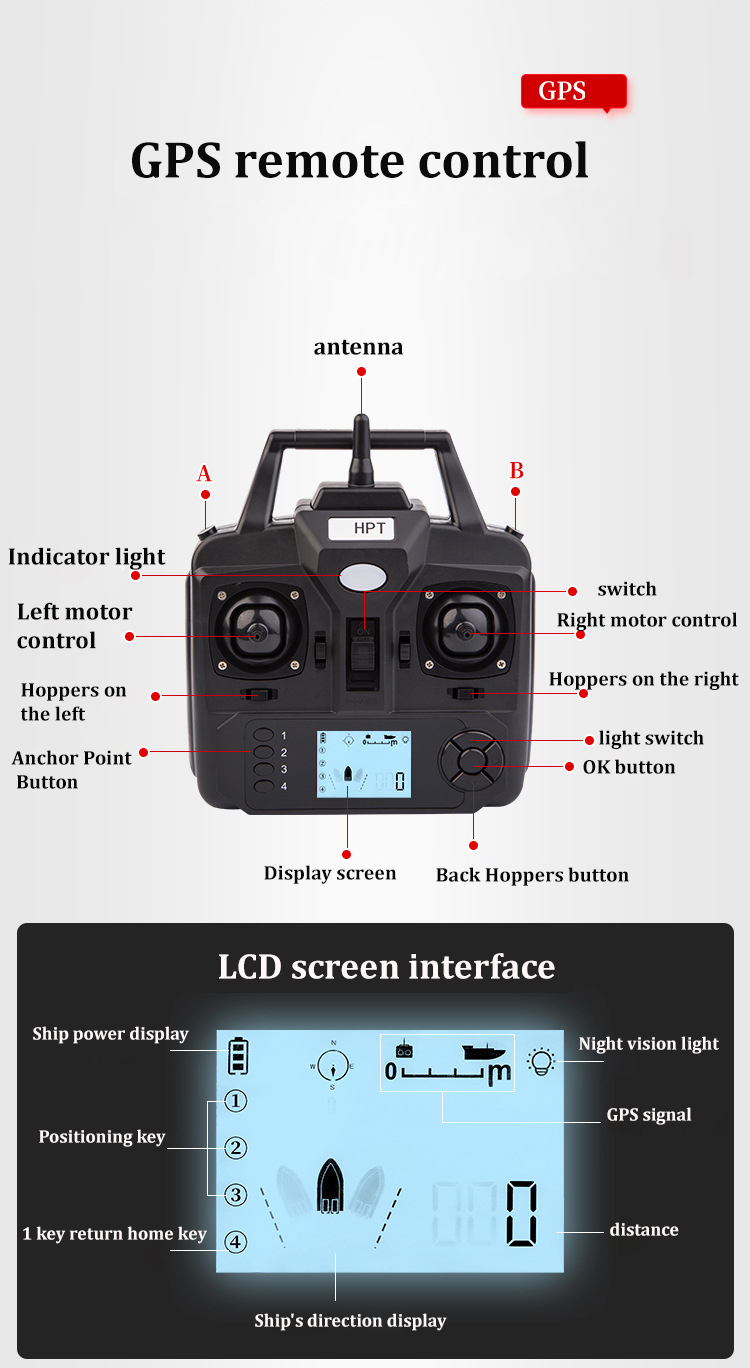 ЖК-дисплей (версия GPS): дисплей питания, дисплей расстояния, дисплей положения, дисплей Ночной светильник и дисплей направления. ЖК-экран пульта дистанционного управления будет отображать мощность лодки, компас и парусники.