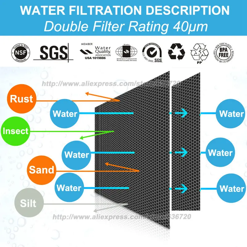 Двойная фильтрация более эффективна, весь домашний спин-вниз осадочный фильтр, предназначен для предотвращения загрязнений, таких как осадок, мусор, ржавчина, кальций, И гранулы песка вместе с другими примесями, достигающими вашего дома и семьи, наслаждайтесь чистым питьем и приготовлением воды с помощью этой промывочной и многоразовой фильтрующей системы.