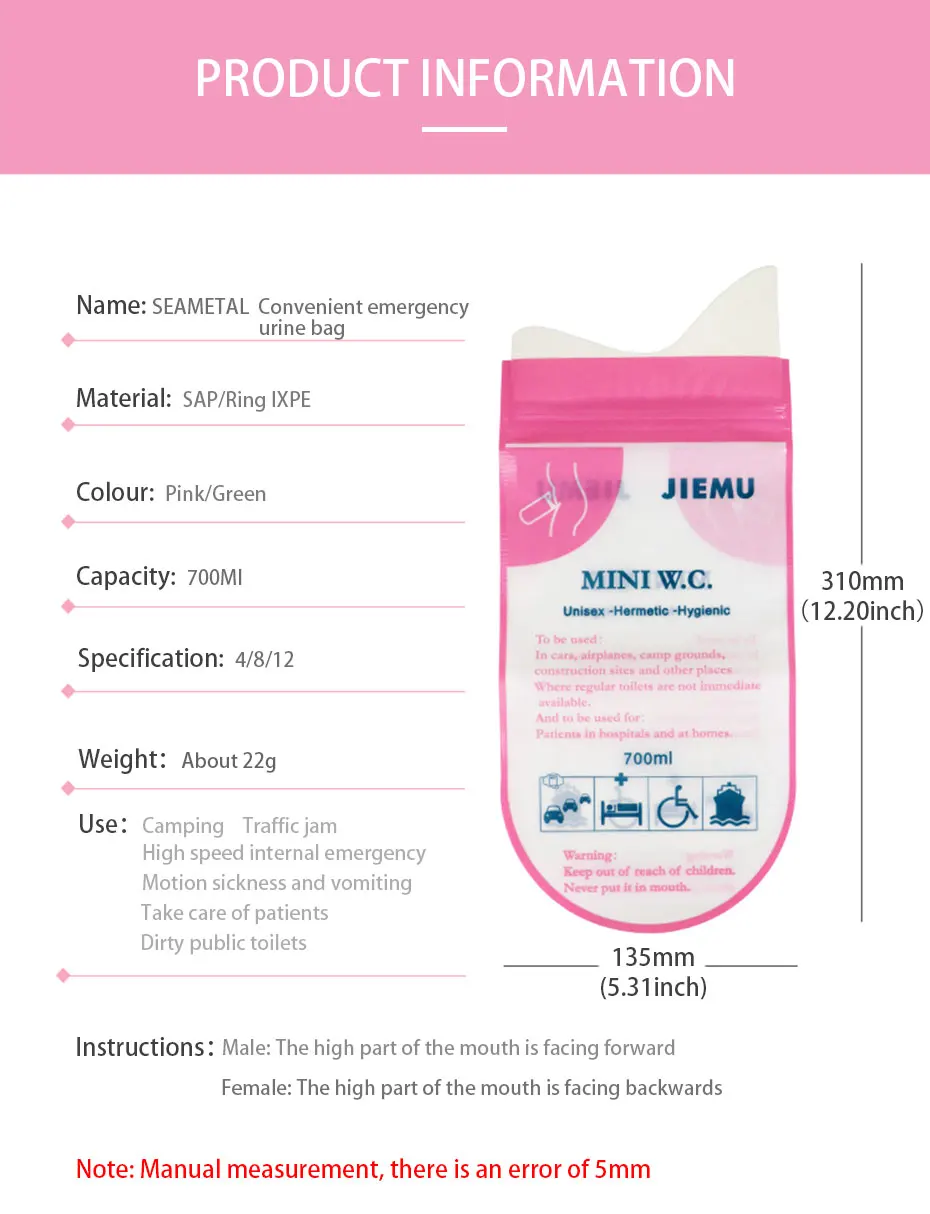 2. Дорожные одноразовые пакеты для писсуар, малый вес и светильник. Подходит для мальчиков, девочек и детей.