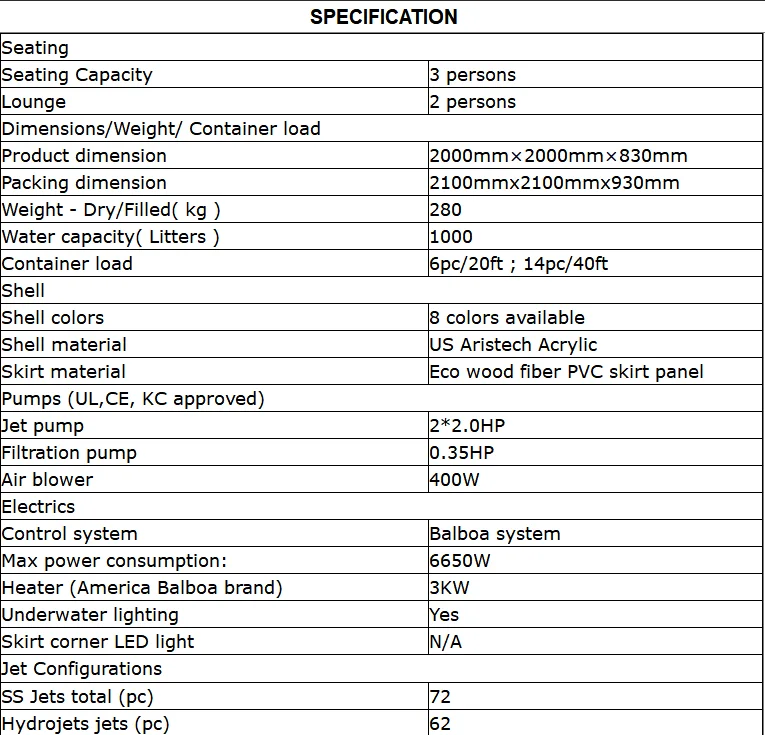 Наша Ванна изготовлена из 4 мм чистого акрила, рамы из нержавеющей стали и выбрать «LX» насос, который с сертификатом CE, UL и SAA. Каждая ванна должна пройти проверку воды 24 часа без протекания. Затем посылка.