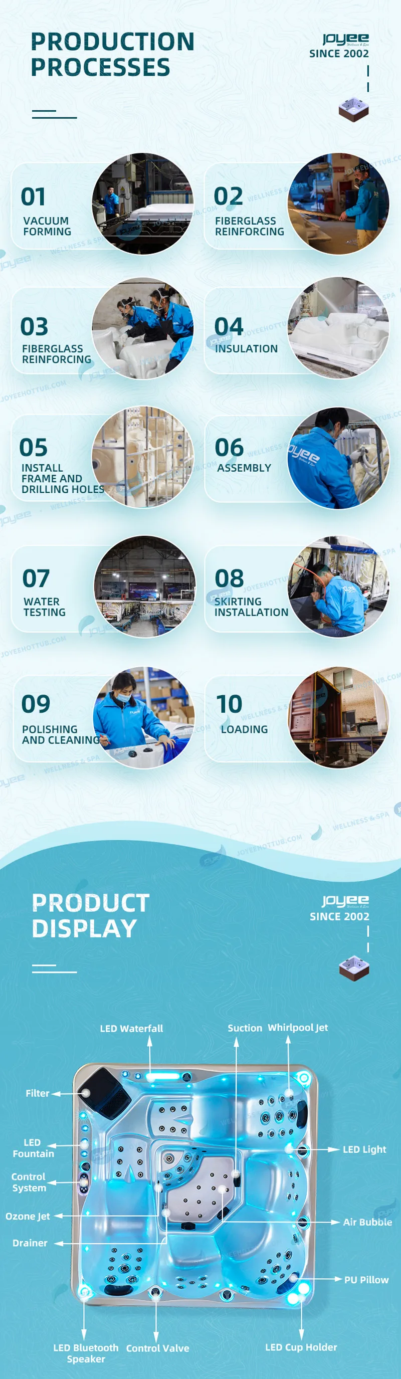 Компания JOYEE была основана в 2002 году и расположена в городе Фошань. И сейчас мы имеем сильную производственную мощность и лидирующую в мире масштабную экономию. Наш рынок в джакузи, ванной, спа-салоне, парной и сауне. С ISO9001