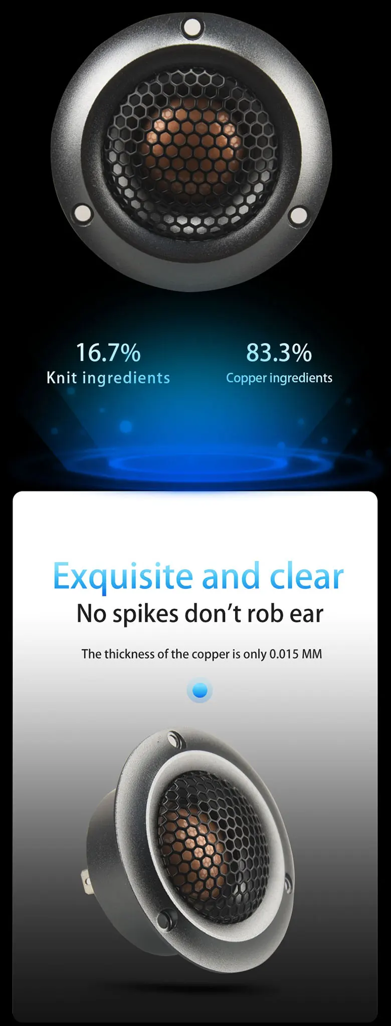 Модифицированные продукты, обновите секретный рецепт вязаной медной пленки, содержит 16.7% ингредиентов покрытия, с 83.3% медными элементами, поэтому мы можем поставить пленку очень тонкой, делать, чем чистая бериллия мембрана не легко сломать. Толщина всего 0,015 мм. Алюминиевая пленка составляет 0,04 0,03 с титановой мембраной далеко от уровня. С патентом с металлической шаровой мембранной структурой, поэтому имеет сильную способность анализа и металлическую пленку с шелковыми краями, свойства бериллиевой медной пленки, разрешая мощность является сильным, свежим и шелковистым, устойчивым к прослушиванию, В течение длительного времени, чтобы покрыть, нет высокой частоты пик, Расширенная частота on-line direct 40 k, улучшенная четкость и детализация, ультра четкость, отсутствие шипов, не ограбивает уши, секретная пластина металлических шариковых блоков.