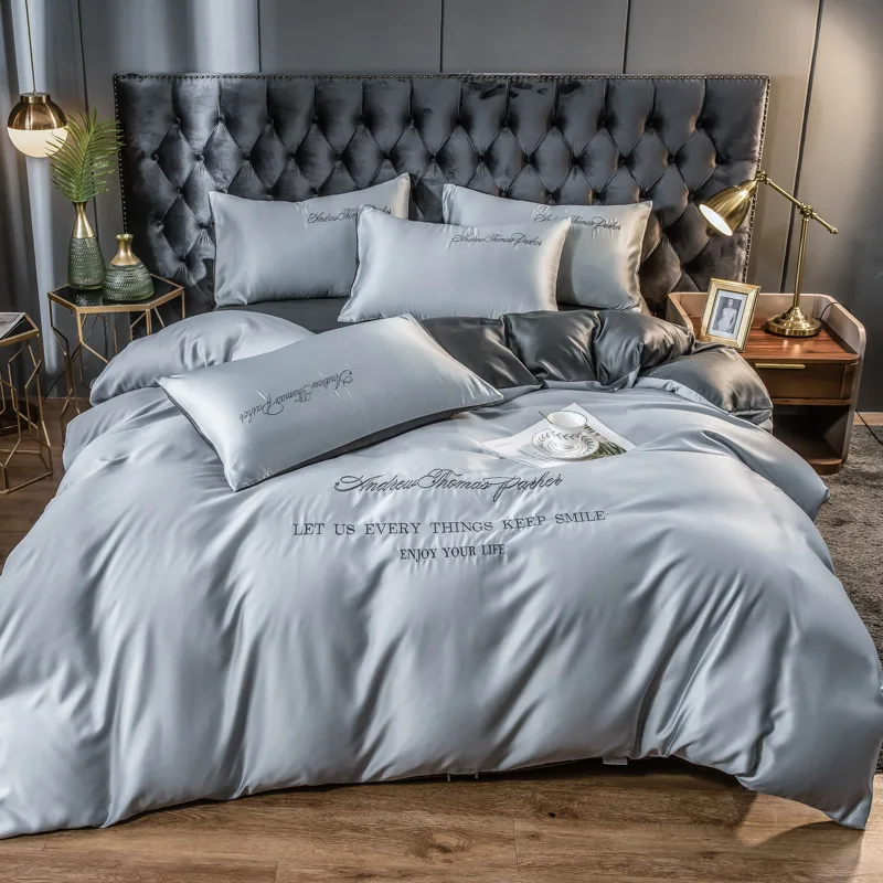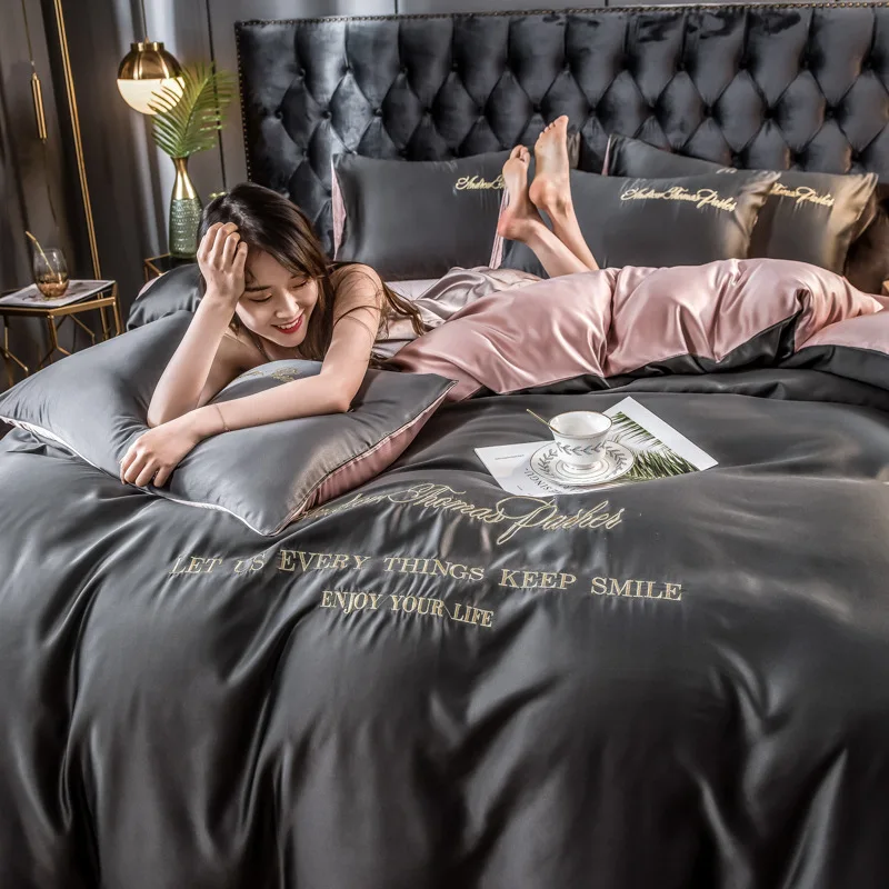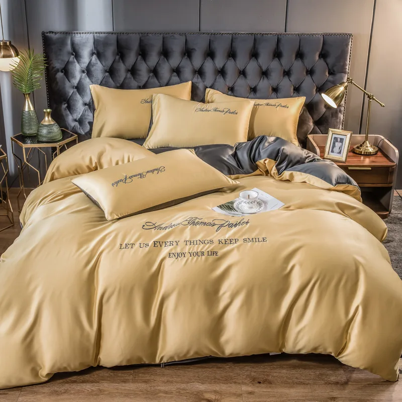 Этот комплект постельного белья из четырех предметов изготовлен из промытого шелка, освежающий и не душный, подходит для использования летом. Материал удобный и приятный для кожи, мягкий и гладкий, плотно прилегающий и удобный, и не легко выцветает после стирки. Стильный и простой дизайн соответствует эстетике современной домашней мебели, а двухцветный дизайн прост и не однообразен.