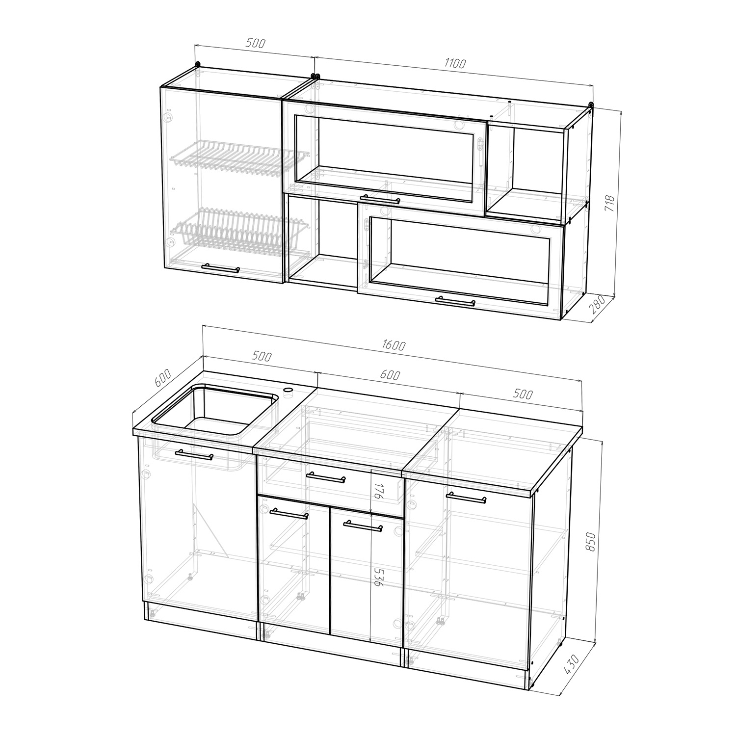 В комплект не входят: бытовая техника, мойка, посудосушитель, смеситель и стеновая панель. Они приобретаются отдельно.