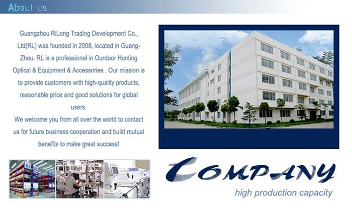 Guang Zhou RiLong trade Development co.ltd(RL) была основана в 2008 году, расположена в Гуанчжоу. RL является профессионалом в области наружной охоты, оборудования и аксессуаров. Наша миссия-предоставить клиентам высококачественные продукты, разумные цены и хорошие решения для глобальных пользователей.