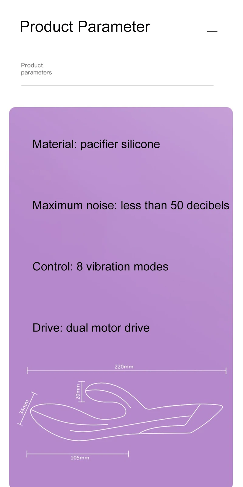 Материал: силиконовая соска Максимальный шум: менее 50 децибел Управление: 8 режимов вибрации Привод: двойной двигатель