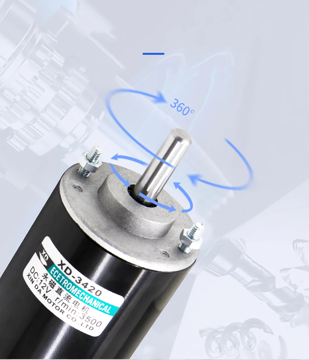 Модель: XD-3420 Название продукта: Постоянный магнит постоянного тока высокоскоростной двигатель Напряжение: 12 В/24 В постоянного тока Скорость без нагрузки: 3500 об/мин/7000 об/мин Ток без нагрузки: 0.31A/0.35A Номинальная скорость: 2400 об/мин/5100 об/мин Номинальный ток: 2.42A/2.76A Мощность: 30 Вт Максимальный крутящий момент: 2KGF.CM Диаметр выходного вала: 8 мм Вес: 500 г