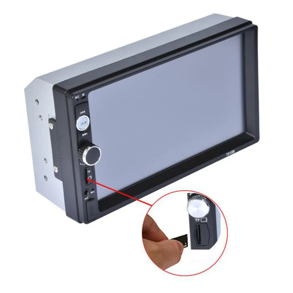 Особенности: 1. Поддержка FM и встроенный вход Aux. 2. Поддержка t-флэш-карты (до 32 Гб) слот и стандартный USB интерфейс. Оснащен камерой заднего вида. 3. Поддержка функции ввода камеры заднего вида. 24 часа цифровой дисплей часы и дата. 4. Может заряжать мобильный телефон или другие usb-устройства. Красочные задние фонари кнопки питания для украшения в вашем автомобиле. 5. Поддержка беспроводного подключения и функции ручного бесплатного телефонного звонка. Описание: 7 дюймов 2 din автомобильное радио высокой четкости MP5 плеер с цифровым сенсорным экраном. Характеристики: Тип материала: металл Внешняя память Maxium: 32 ГБ Размер дисплея: 7 дюймов Специальные Особенности: беспроводной, CD-плеер Размещение: In-Dash Интерфейс: USB/TF/AUX IN Напряжение: 12 В Размер изделия: 2 din Разрешение экрана: 800*480 Модель: 7010B Формат видео: RMVB/RM/FLV/3GP/MPEG/DIVX/XVID/DAT/VOB/AVI/MP4 Формат аудио: MP3/WMA/WAV Формат изображения: JPG Выходная мощность усилителя/Количество каналов: 45 Вт * 4 Беспроводная версия: V3.0 Цвет: черный Размер изделия: 175*100*60 мм Посылка включает в себя: 1 * хост мультимедийного плеера 1 * кабель питания 1 * Руководство пользователя 1 * пульт дистанционного управления (без аккумулятора)
