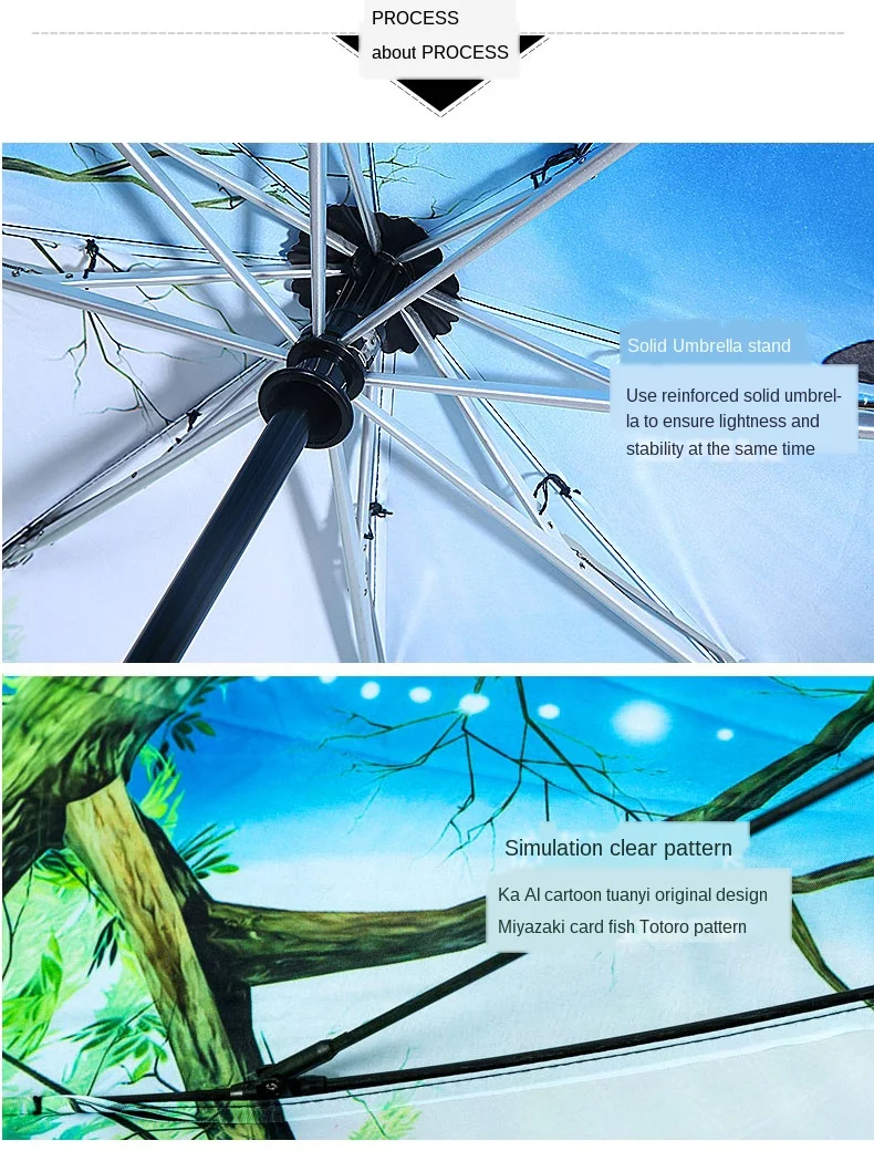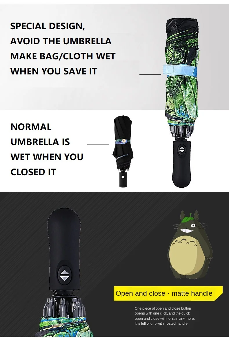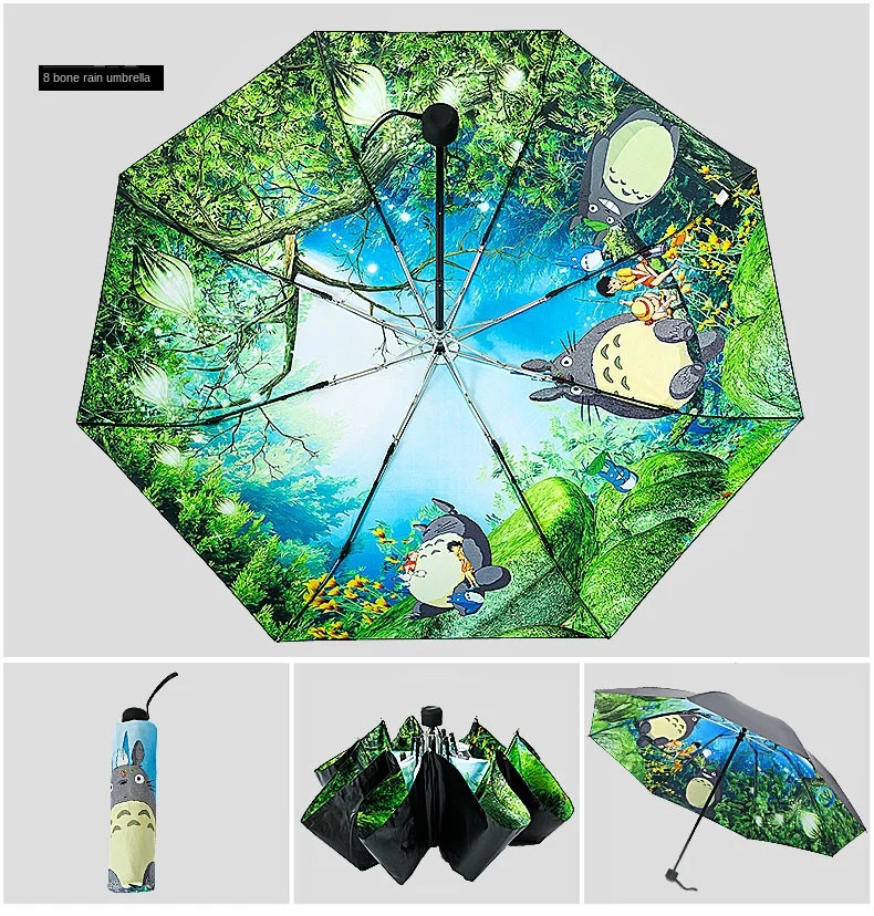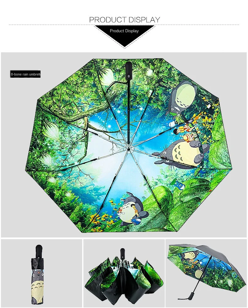 Особенности: Тип: Ручной Зонт с 3 сложениями Рисунок: Мой сосед Тоторо Вес: 320 до 400 г Закрытая длина: 26 см Открытый Диаметр.: 104 см Ребра: 8 шт. Примечания:Черное внешнее покрытие в 4 раза, ультрауф-защита и светильник. UPF50 +, UVA<0.5%.