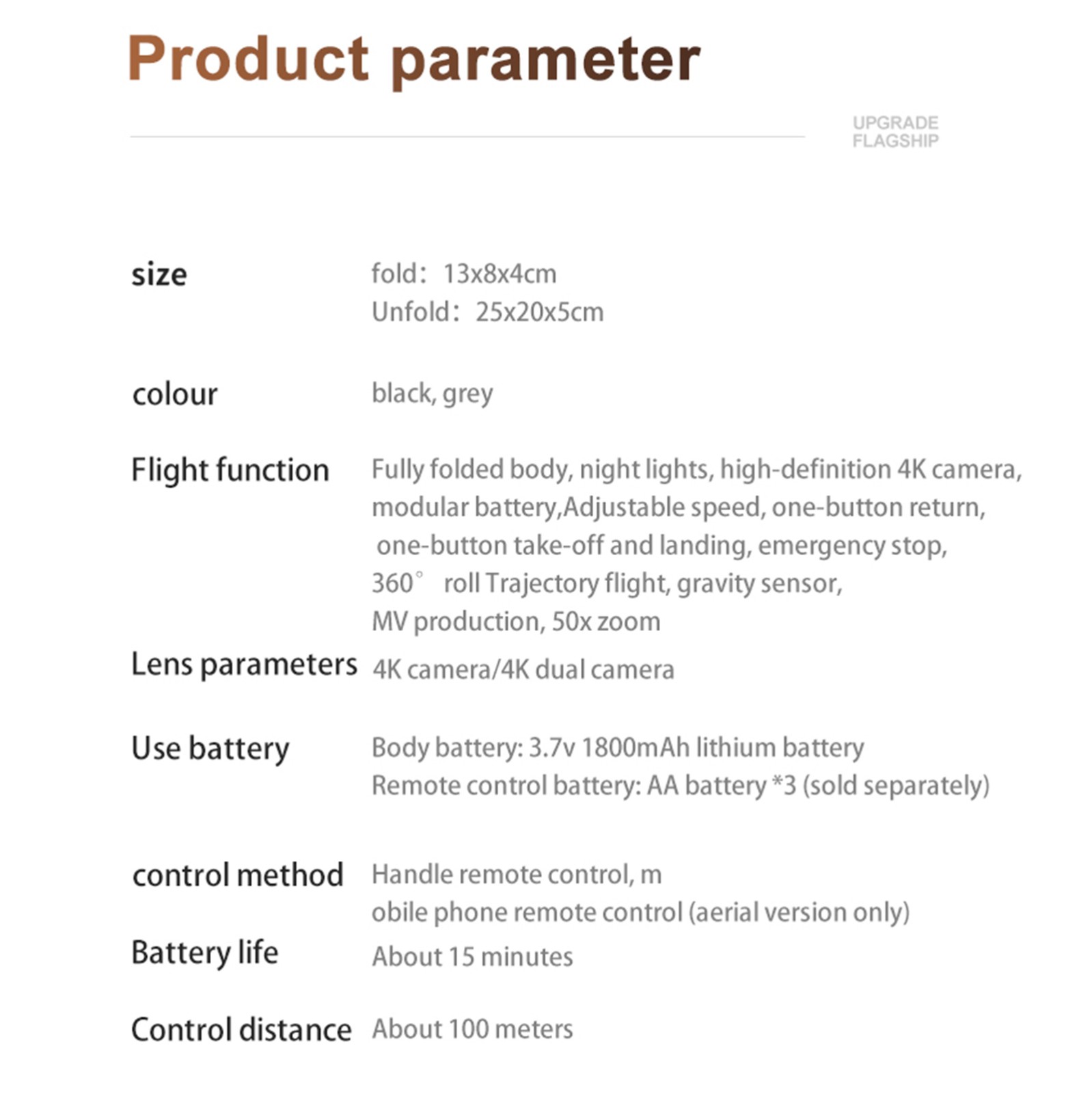 Частота: 2,4G Канал: 4CH Двигатель: 816 мотор без сердечника Квадрокоптер Батарея: 3,7 V 1800 мАч литиевая батарея (в комплекте) Батарея передатчика: 3 1,5 AA Батареи (не входят в комплект) Время полета: 15 минут Время зарядки: 100 минут Расстояние дистанционного управления: 100 м Цвет: черный, серый Камера: 4K (Двойная камера) Размер Четырехугольная: 25x20x5 см (рука не сложена,)Характеристика: