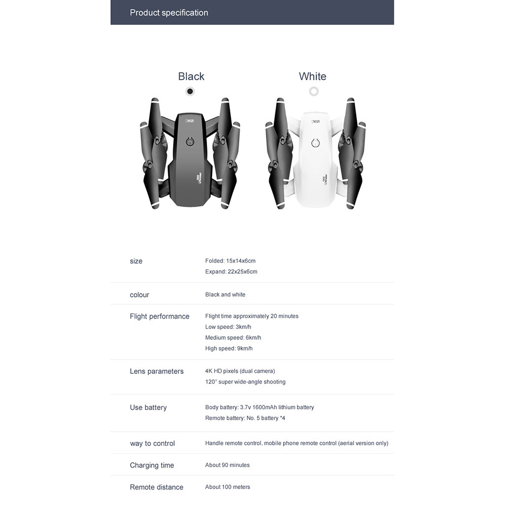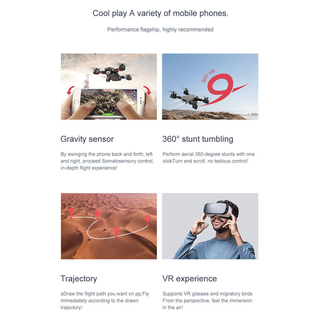 Вверх/вниз, вперед/ Назад, влево/вправо, Безголовый режим, одна автоматическая кнопка возврата, высота Режим удержания, WiFi FPV, свернутый на 360 °