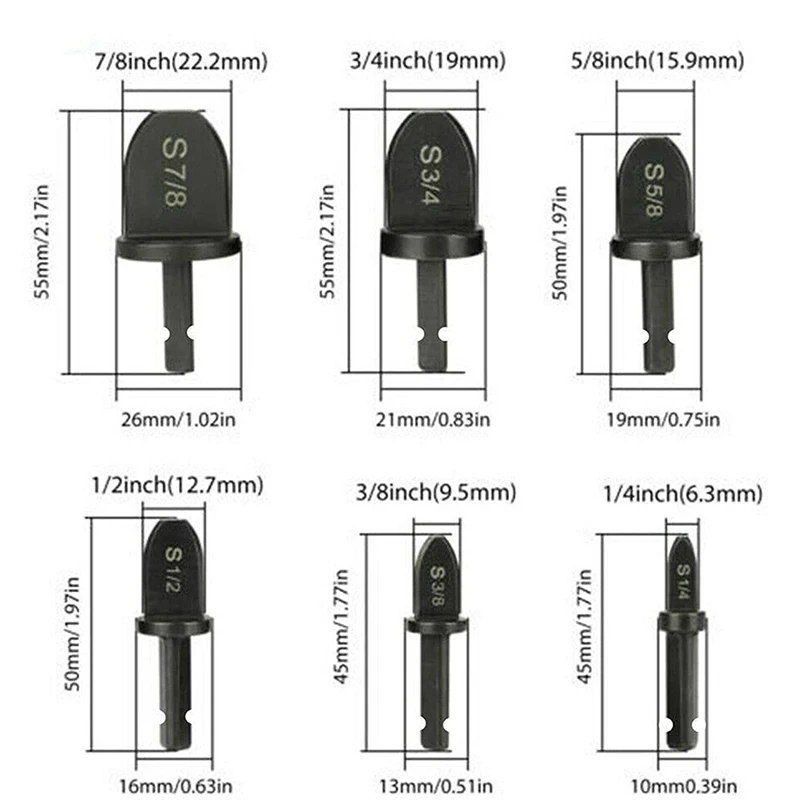 Размеры: 5 штук колокольчика расширитель рта, диаметр ручки: 1/4 дюймов (6,35 мм) Шестигранная ручка Технические характеристики: 3/4 дюймов (19 мм), 5/8 дюйма (15,9 мм), 1/2 дюймов (12,7 мм), 3/8 дюйма (9,5 мм), 1/4 дюйма (6,3 мм); 6 штук расширитель: 7/8 дюймов (22,2 мм), 3/4 дюймов (19 мм), 5/8 дюйма (15,9 мм), 1/2 дюйма (12,7 мм), 3/ 8 дюймов (9,5 мм), 1/4 дюйма (6,3 мм)