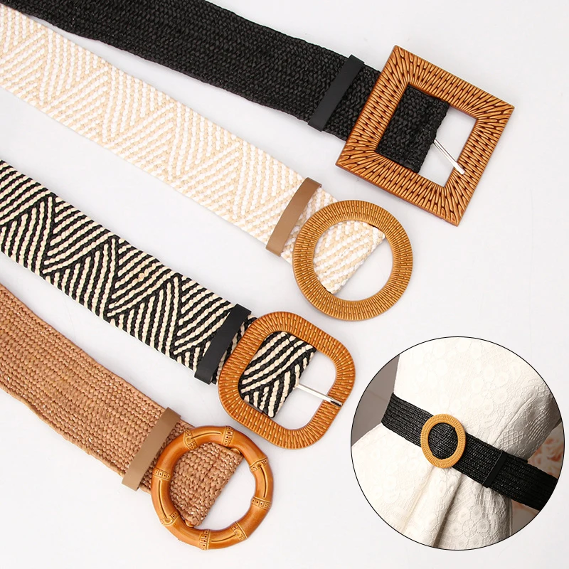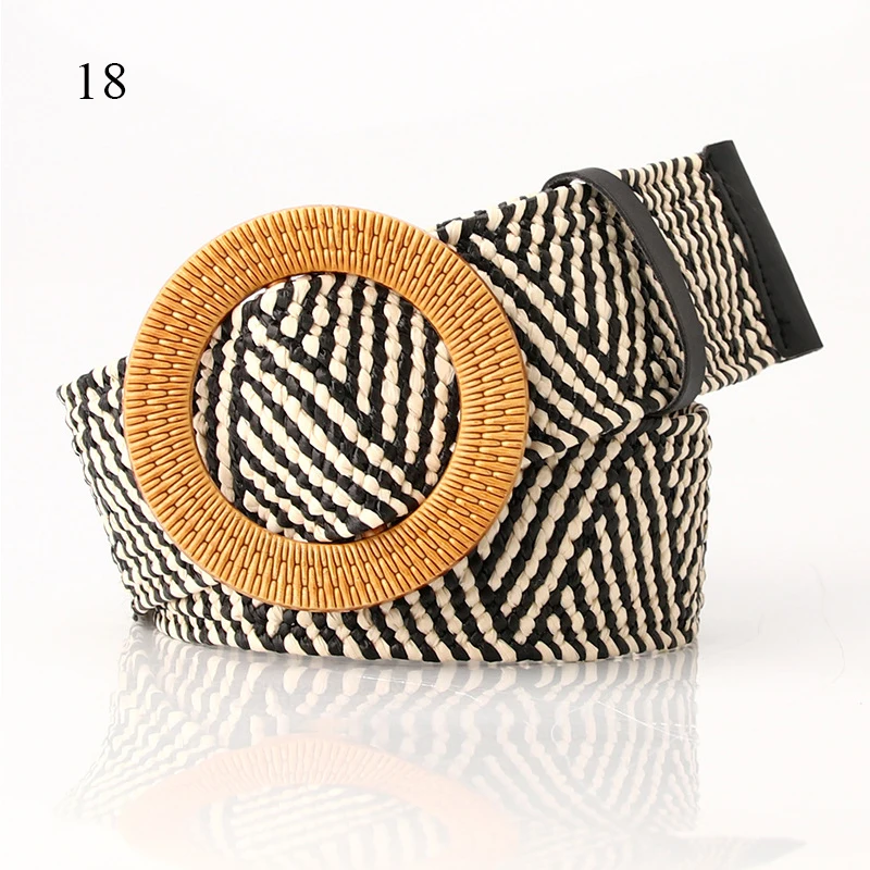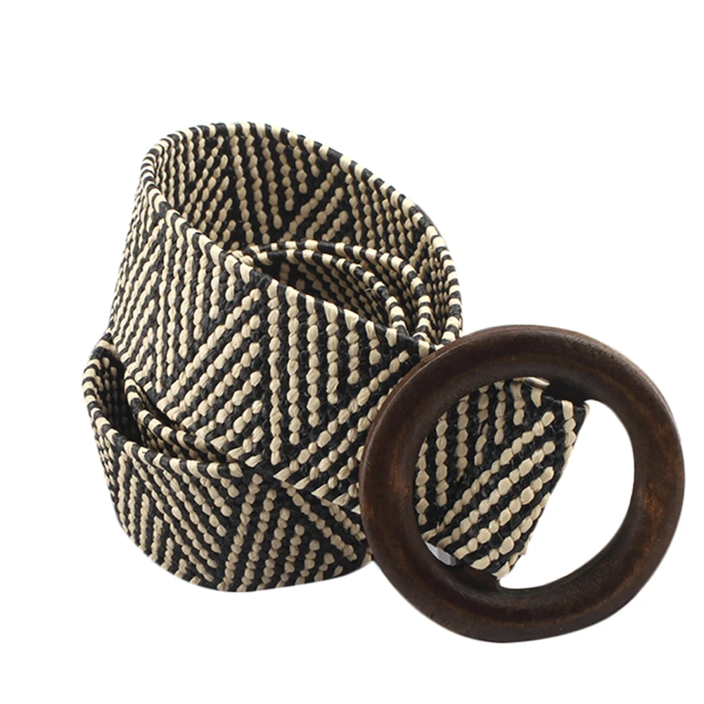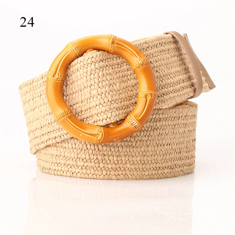 Винтажный плетеный пояс в стиле бохо, Круглый Деревянный широкий ремень с гладкой пряжкой