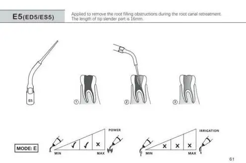 E3: рекомендуется для плавления gutta-percha.Immerse инструмент в eugenol, прежде чем вставлять его в канал. Слегка нажмите инструмент против конуса Гутта-перча и активируйте скалер для уплотнения до тех пор, пока канал не будет filld