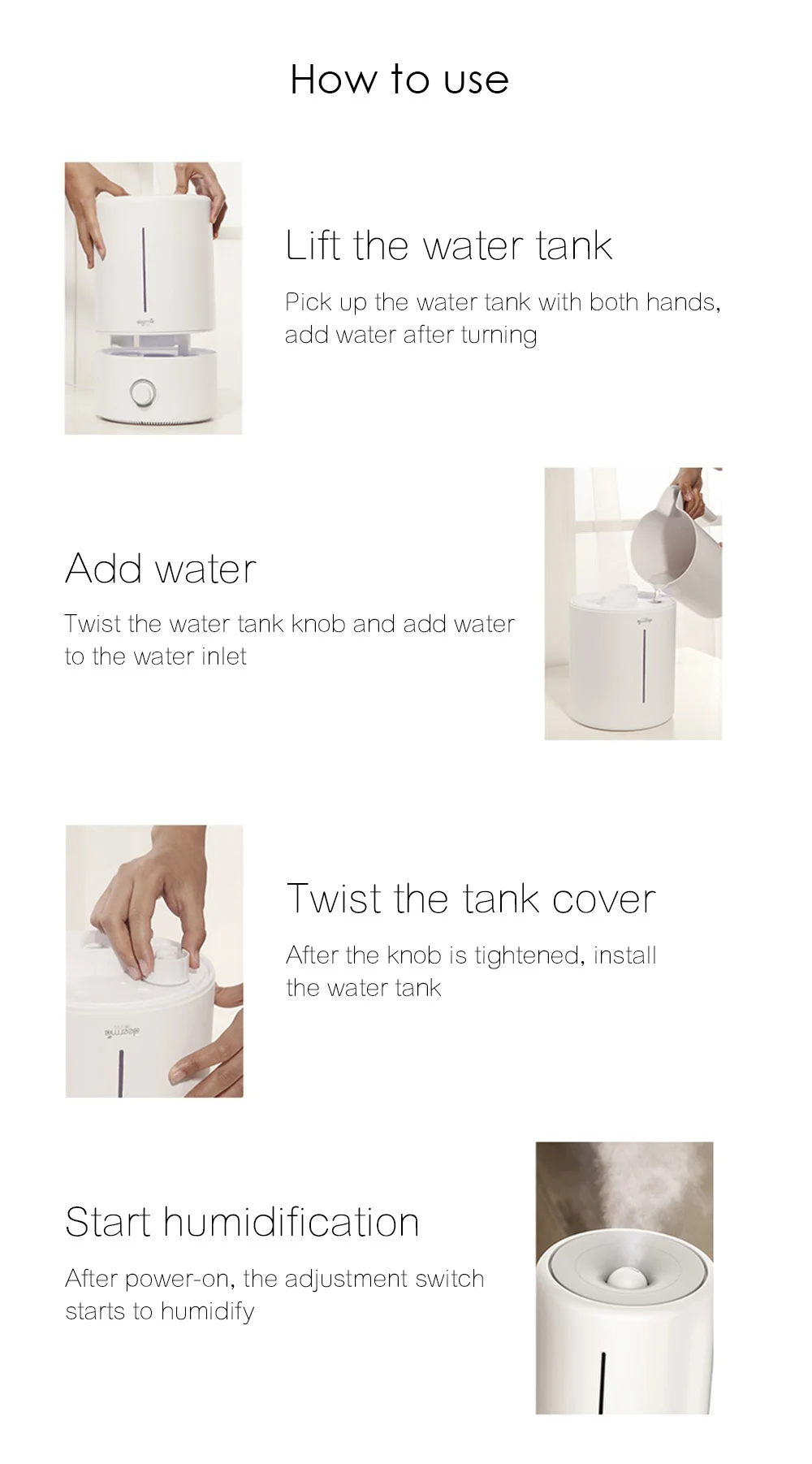 Как использоватьПоднимите резервуар для водыВозьмите резервуар для воды с обеих рукДобавьте воду после поворота Добавить водуПоверните ручку резервуара для воды и добавьте воду к входу воды Закрутите крышку бакаПосле затягивания ручки Установите резервуар для воды Запуск увлажненияПосле включения питания переключатель регулировки начинает увлажнять
