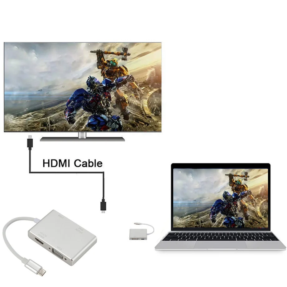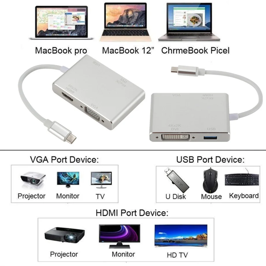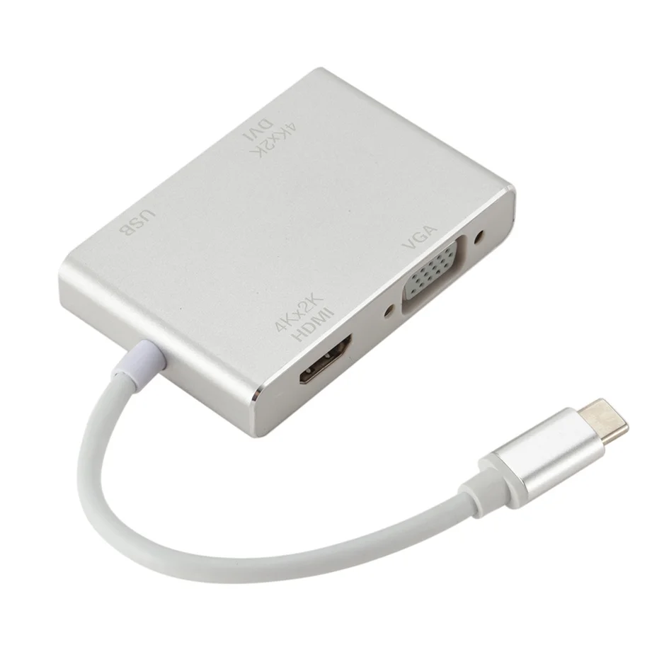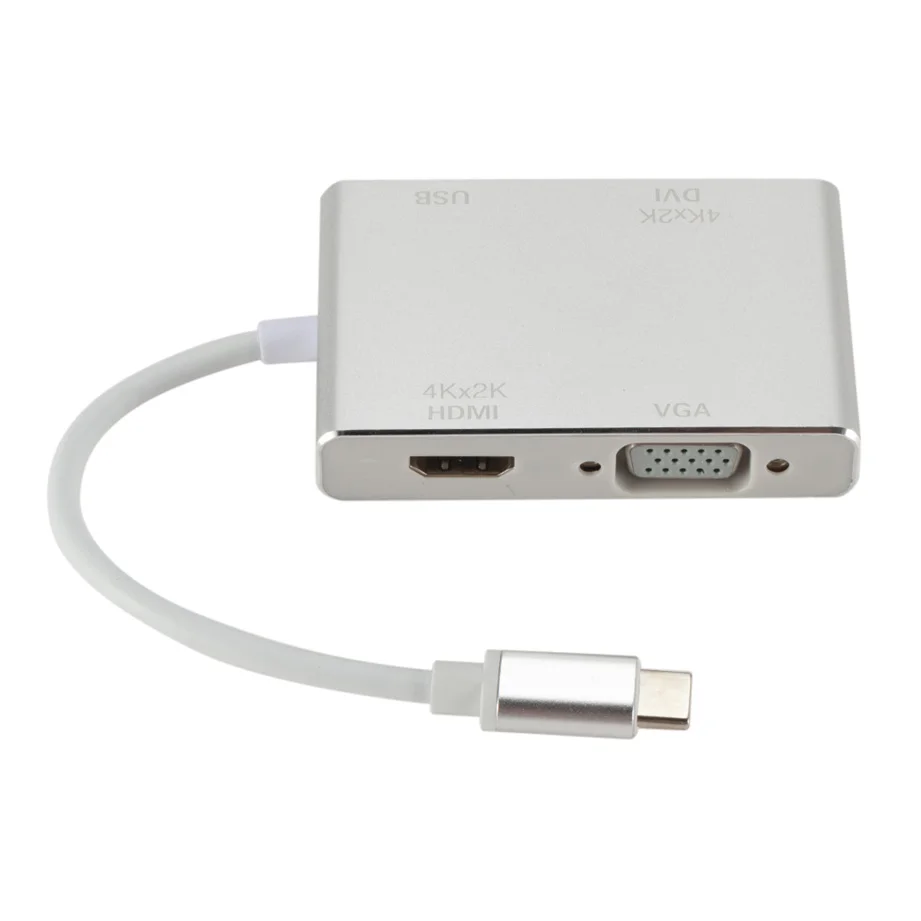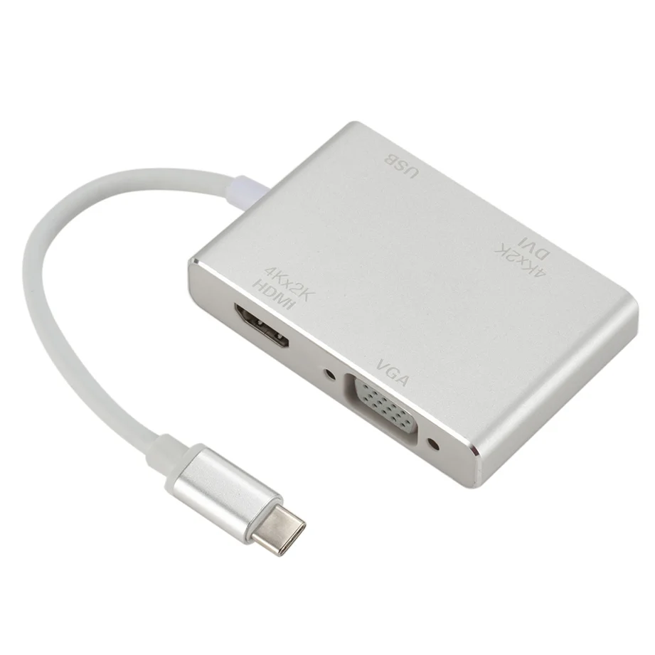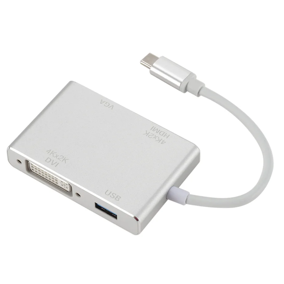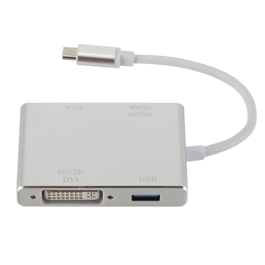 Продукт Особенности: 1,4-в-1. Этот многопортовый Адаптер преобразует ваш порт type-C в 1 выход HDMI, 1 выход VGA, 1 выход DVI и 1 выход USB3.0. Заменяет потребность в нескольких адаптерах. 2. Преобразуйте сигнал ноутбука через USB-C порт в порт HDMI, VGA или DVI проектора, монитора, телевизора и другого выставочного оборудования. Порты HDMI/VGA/DVI не могут использоваться одновременно. 3. Поддержка высокого разрешения ed: Поддержка HDMI 4K x 2K 30Hz(3840x2160), поддержка вниз 1080P, 720P. Разрешение VGA до 1920x1200 @ 60 Гц. Разрешение DVI до 1920x1080 @ 60 Гц. 4. Алюминиевый корпус: гладкий дизайн и устойчивость к коррозии, алюминиевый корпус обеспечивает лучшее рассеивание тепла, обеспечивает жесткость и предлагает вам лучшую производительность сигнала. Характеристики: разъем A: USB 3,1 type C male (Альтернативный режим DisplayPort) Разъем B: HDMI female + VGA female + DVI female + USB3.0 female Примечание: 1. Этот адаптер совместим только с ноутбуком, он не будет совместим со смартфонами или планшетами. 2. Ваш ноутбук должен поддерживать «Альтернативный режим DisplayPort» (Alt Mode) через USB-C. 3. Если продукт не работает, сначала Подключите адаптер к вашим устройствам, а затем перезагрузите устройства. 4. Теплое напоминание: для некоторых совместимых устройств может потребоваться несколько секунд для синхронизации данных с компьютера с вашим монитором, пожалуйста, будьте терпеливы. 5. Для некоторых совместимых устройств Порт USB 3,0 иногда не может работать нормально. Эта проблема вызвана несовместимостью системы, а не самим продуктом. 6. Не подключайте другой адаптер/конвертер к этому адаптеру для второго преобразования сигнала, мы не можем гарантировать, что он хорошо работает. 7. Порты HDMI/VGA/DVI не могут использоваться одновременно. 8. При подключении только VGA дисплея, Пожалуйста, подключите аудио кабель для передачи аудио. 9. Разрешение 4K требует 4K оборудованный источник, кабель HDMI и выходной дисплей. 10. Это не двунаправленный адаптер. Может преобразовывать сигнал только из порта Type-C в порт HDMI/VGA/DVI/USB3.0. 11. Некоторые хосты USB-C/Thunderbolt 3 поддерживают только 1 Внешний дисплей. Посылка включает в себя: Адаптер для TYPE-C-1 шт.