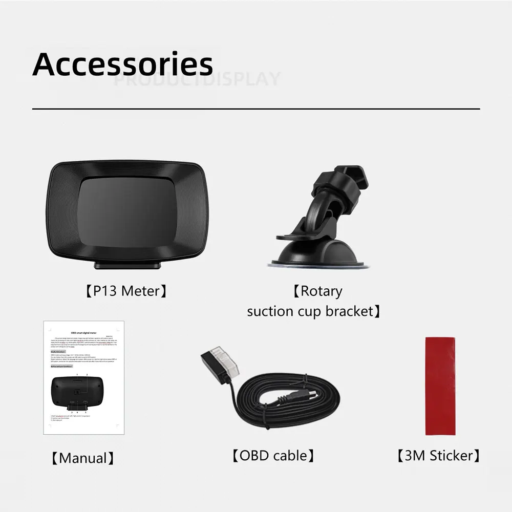 Информация о дисплее: скорость транспортного средства, температура воды, напряжение, расход топлива, об/мин, один пробег, общий пробег, кумулятивное время вождения, количество звезд, поиск высоты, часы, давление впуска, температура моторного масла, соотношение воздуха и топлива, турбо давление, дроссельная заслонка, температура впуска, нагрузка двигателя, испытание на ускорение, Испытание тормозов, обнаружение неисправностей, четкий код неисправности;
