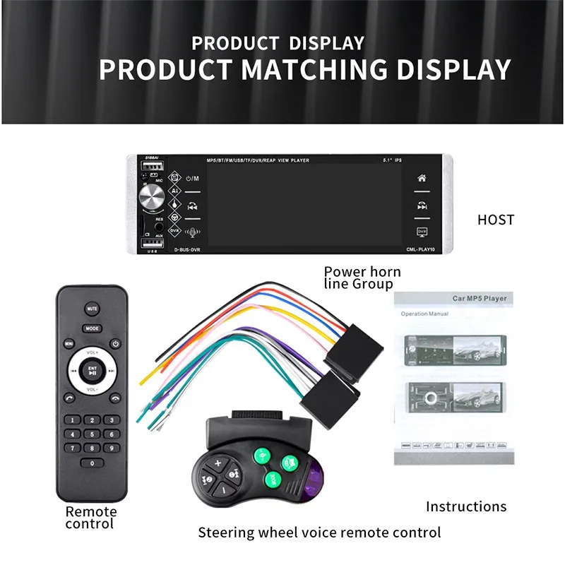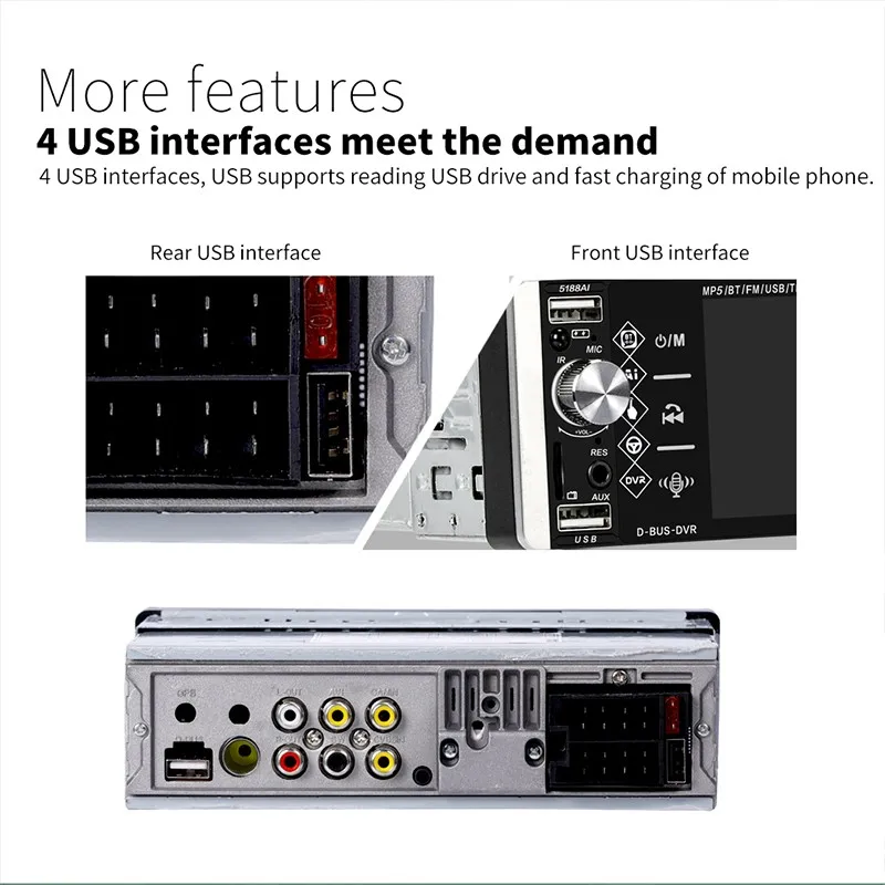 Название продукта: 5,1 дюймов IPS экран Голосовое управление беспроводной связи по стандарту Bluetooth для быстрой зарядки с usb-портом для зарядки автомобиля MP5 плеер 5188 Характеристики: Экран Размер: 5,1 дюйм (ов) Материал: металлический пластик Экран: IPS экран Освещение кнопок: 7 цветов Версия Bluetooth: 4,2 Выходная мощность динамика: 4*45 Вт Размер изделия: 21,1*8,1*15 см, Вес посылка: 600 г/800 г Особенности: FM/AM многоканальное вещание Двустороннее соединение на базе Android/iOS Можно ли использовать пульт дистанционного управления: с Поддержка голосового управления рулевого колеса Поддержка RDS/AM Поддержка заднего вида Поддержка: Mirrorlink (Поддержка Android 10) Поддержка внешнего микрофона Разрешение: 1120*480 Передний и задний 4-USB интерфейс Передний и задний AUX интерфейс Система: wince * Мобильная Сеть * Функция модуляции частоты FM: Да * Функция Bluetooth (Bluetooth отвечает на звонки, Bluetooth музыка) * Идентификатор звонящего * Поддержка большой емкости sd-карты, u-диска и другого воспроизведения памяти * Поддержка AUX аудио входа * Электронно настроенное стерео радио * Тест на защиту от нескольких замыканий (перегрузка, перенапряжение, короткое замыкание) * Беззвучный ключ * Интеллектуальный Голос Поддержка нескольких языков: английский, португальский, русский, испанский, итальянский и т. Д. Примечание: выход видео в эфир поддерживает только один экран и не поддерживает одновременный дисплей с двойным экраном Продукт содержит: 1 * пульт дистанционного управления 1 * Инструкция 1 * шнур питания 1 * Управление клыком 1 * Светодиодный фотоаппарат (4 светодиодный/8 светодиодный/12 Светодиодный)