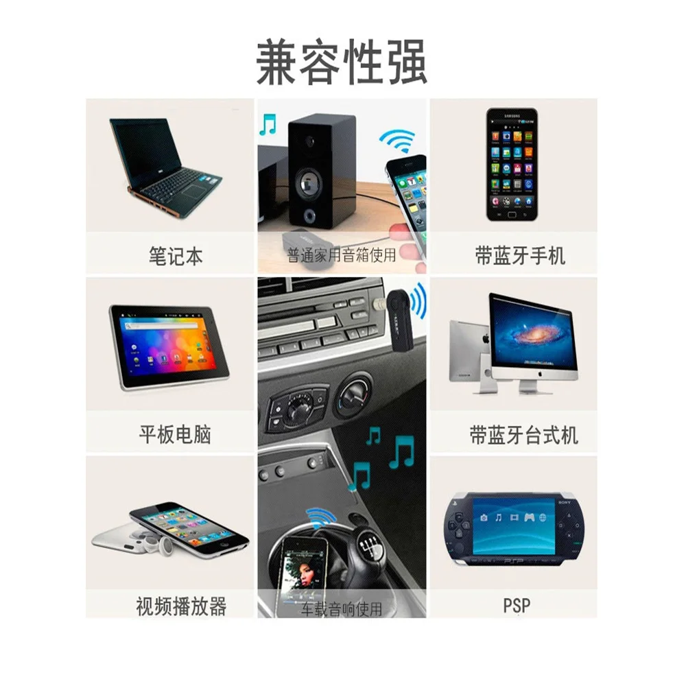 1. Сделайте ваш автомобиль AUX audio sytem и домашний кинотеатр AV HiFi, окружающая система, совместима с bluetooth, получайте музыку с Bluetooth, включающей устройства, такие как iPhone, iPad, iPod, для HTC для смартфона Samsung или Bluetooth ПК, ноутбука.