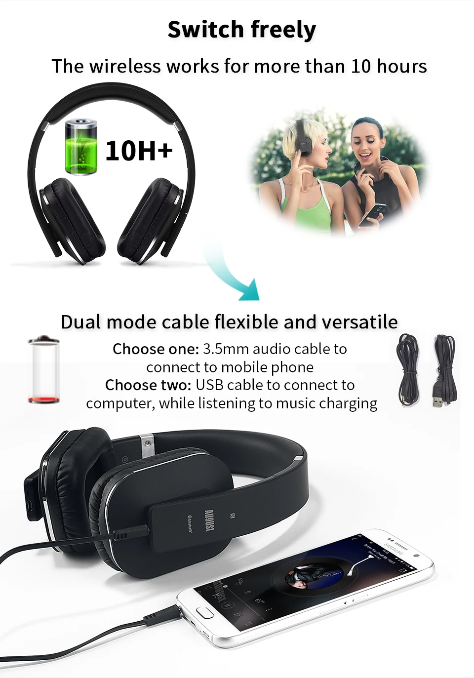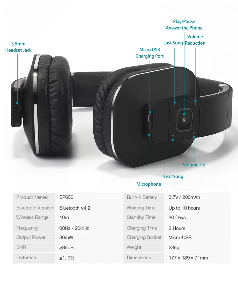 Беспроводные Bluetooth наушники EP650 с Miultipoint-Наслаждайтесь насыщенным звуком басов и оптимальным комфортом от этой беспроводной гарнитуры с NFC и aptX-LL - Bluetooth 4,2 наушники с EQ APP ControlОсобенности:Bass Rich Sound-вообразите музыку с вашего мобильного звучания басов богатых, с четко определенным тройником, эти беспроводные наушники используют блоки драйвера 50 мм для обеспечения оптимального качества звука из любого источника. Комфортный гибкий дизайн-Наслаждайтесь превосходным комфортом, легким, с толстой и роскошной подкладкой, удлиненной повязкой на голову и удобными гибкими наушниками, эти накладные наушники очень приятно носить. Даже для использования в течение всего дня. Аудио и видео в синхронизации-Наслаждайтесь любимыми поздними ночными ТВ-шоу и фильмами, не беспокоясь о доме, эти bluetooth-наушники aptX-LL подключаются за считанные секунды к телевизору или bluetooth-передатчику без каких-либо заметных задержек между изображением и звуком. Swift Pair Bluetooth-просто нажмите на телефон к разъему NFC или Выполните сопряжение через настройки, чтобы слушать любимые треки за считанные секунды. И не имеющими Блютуз устройствами 3,5 мм проводной аудио в делает эти замечательные наушники совместимы практически с чем угодно. Управление приложением EQ, настраиваемый звук включен-используйте свое любимое приложение EQ для настройки этих bluetooth-наушников так, как вам нравится, их устройства премиум-драйвера могут воспроизводить любую звуковую стадию, которую вы набрали, не теряя точность. Многоточечная функция-позволяет подключать наушники EP650 к 2 устройствам источника одновременно. Примечание: При подключении наушников к телевизору через аудиокабель bluetooth не будет работать. Если у вашего телевизора нет функции bluetooth, наушники не могут подключаться к телевизору через Bluetooth, если вы хотите подключить их через Bluetooth, вы можете купить наш bluetooth-передатчик:/MR265/MR275