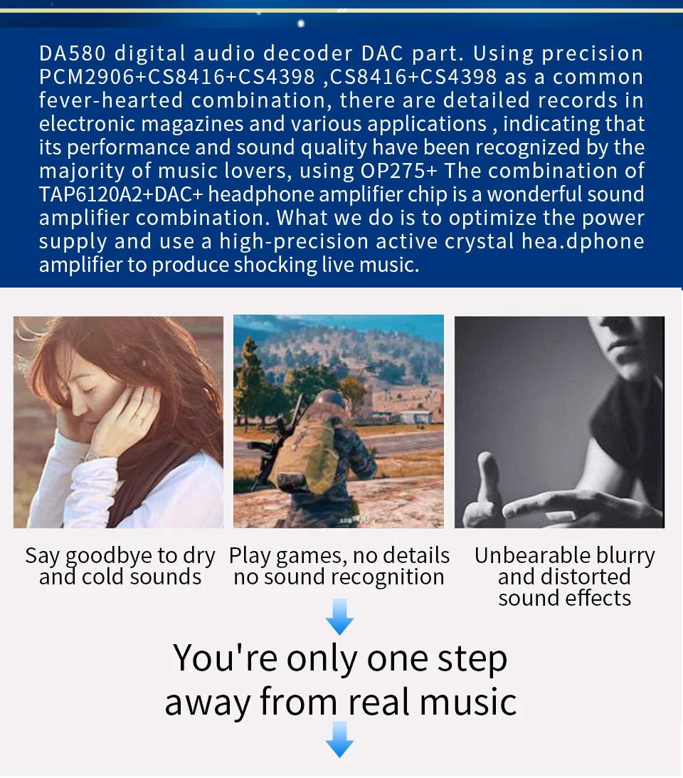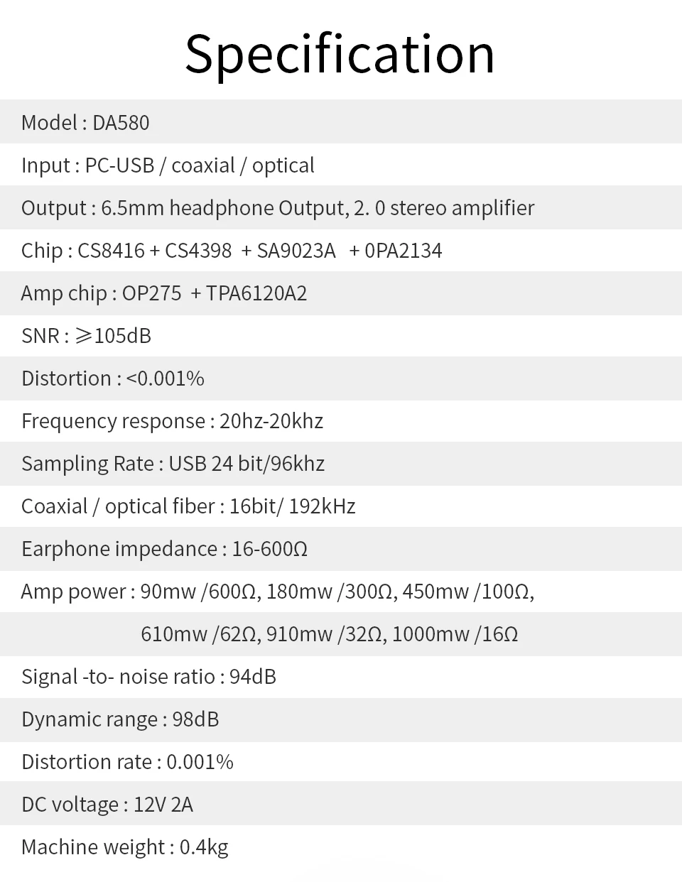 DA580 цифровой аудио декодер DAC часть. Используя точность PCM2906 + CS8416 + CS4398 ,CS8416 + CS4398 в качестве общей Hever-Hearth комбинации, есть подробные записи в электронных журналах и различных приложениях, что указывает на то, что его производительность и качество звука были признаны большинством любителей музыки, использование OP275 + сочетание чипа усилителя TAP6120A2 + DAC + наушников-прекрасная комбинация усилителя звука. Что мы делаем, это оптимизировать источник питания и использовать Высокоточный активный усилитель hea.dphone для создания шокирующей живой музыки.SA9023-это высокопроизводительный потока аудио процессор, поддерживает 24-битное частота дискретизации, USB Совместимость, а также поддерживает USB2.0 Бесплатная езды на автомобиле. Поддержка до 24 бит 96K частота дискретизации, поддержка: 33K, 44,1 K, 48K, 88,2 K, 96K частота дискретизации. 0PA2134 является a - paragraph низким уровнем шума, низким искажением двойного аудио op amp, в работе с аудиосигналом, не уступает США NS компании ультра-низкое искажение op amp LM4562. В OPA2134 есть два идентичных аудио операционных усилителя, коэффициент усиления полосы пропускания GBW-8 МГц, частота SR-20 в/с, а искажение-всего 0.00008%. Хорошо полученные CS8416 в аудиофилах имеют частоту дискретизации до 192 кГц. Профессиональные аудио продукты обмен S/PDIF и AES/EBU аудио данных. Он имеет очень низкий механизм восстановления часов дрожания, который может генерировать очень чистые восстановленные часы от входного аудиопотока. Благодаря чрезвычайно низкой производительности дрожания 200 ps CS8416 стал идеальным выбором для лидирующих в отрасли цифровых аудиоприемников 192 кГц. CS4398 представляет собой 120 дБ 24 бит 192 кГц низкочастотный стерео DAC с поддержкой DSD, с цифровым предыскажений, полу-дБ контроль громкости, смешивание каналов ATAPI и по желанию. Быстрое и медленное сворачивание цифровых интерполяционных фильтров. Лист 50 кГц. Включение фильтра, получение DSD аудио и частота дискретизации данных от 32 кГц до 200 кГц, выбор цифровых фильтров, способных обеспечить превосходное качество звука. Высокоэффективный HIFI усилитель для наушников TPA6120A2 использует высокопроизводительный чип TPA6120A2 от американской компании TI, специально разработанный для HIF | Верхнего усилителя компьютера. Искажения такие же низкие, как и 0.000635%. TPA6120A2 в индустрии HIFI уже давно известен, усилитель серии PHA Sony без исключений все используют TPA612A2. Динамический диапазон чипа C1237 составляет 120 децибел, коэффициент конверсии-1300 в/с, а искажение-0,00014 thd + n. Отношение сигнал/шум 120 децибел отвечает требованиям к DVD аудио и супер аудио cd/cd ( sacd ) , и может идеально управлять 30 Ом до 600 Ом усилителей наушников. Реле NEXEM, импортированное из Японии, использует технологию разделения напряжения и Высокоточный потенциометр для калибровки баланса. Баланс положительного и отрицательного напряжения чрезвычайно высок. Еще один высокоемкий Профессиональный фильтрующий конденсатор для фильтрации, источник питания довольно чистый. Подавляет низкий уровень шума, делает наушники почти неслышными и делает ваши уши комфортными. Модель: DA580 Вход: PC-USB/коаксиальный Оптический Выход: 6,5 мм разъем для наушников Выход, 2. 0 чип стереоусилителя: CS8416 + CS4398 + SA9023A + 0PA2134 чип усилителя: OP275 + TPA6120A2 SNR : 105dB Искажение: <0.001% Частотная характеристика: 20 Гц-20 кГц Частота дискретизации: USB 24 бит/96 кГц коаксиальный/Оптическое волокно: 16 бит/192 кГц Сопротивле