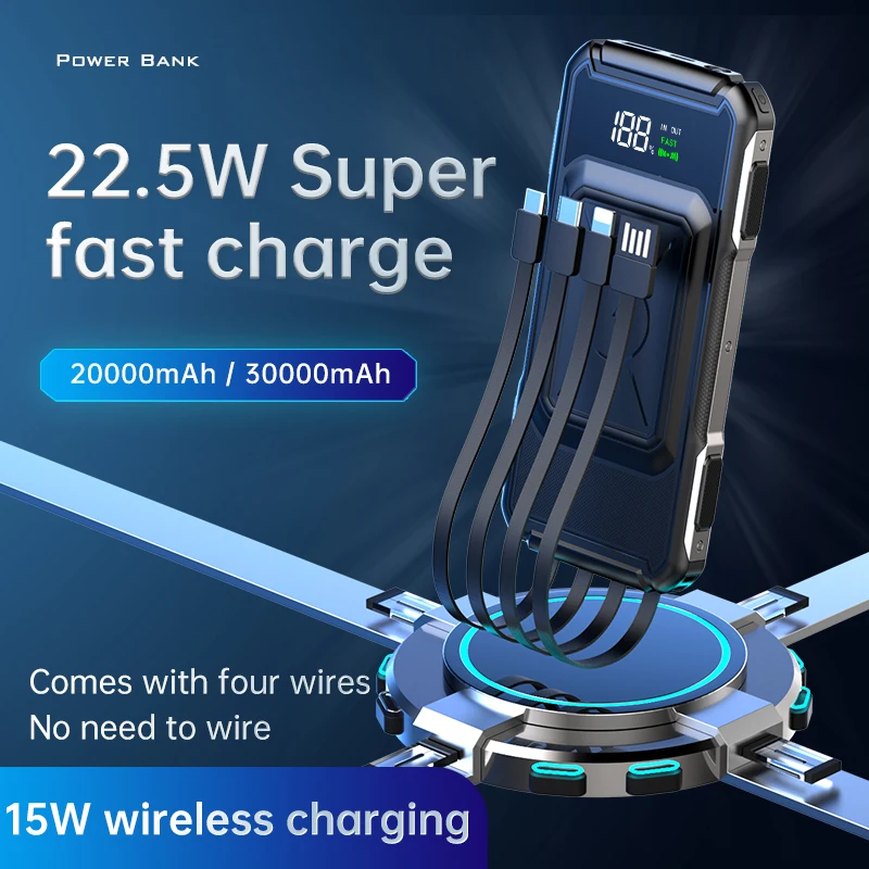 15W Fast Qi Wireless Charger Power Bank 30000mAh 22.5W QC PD 3.0 Fast Charging Powerbank Built in Cable for iPhone 12 Huawei Xiaomi Samsung S21 Poverbank with Digital Display