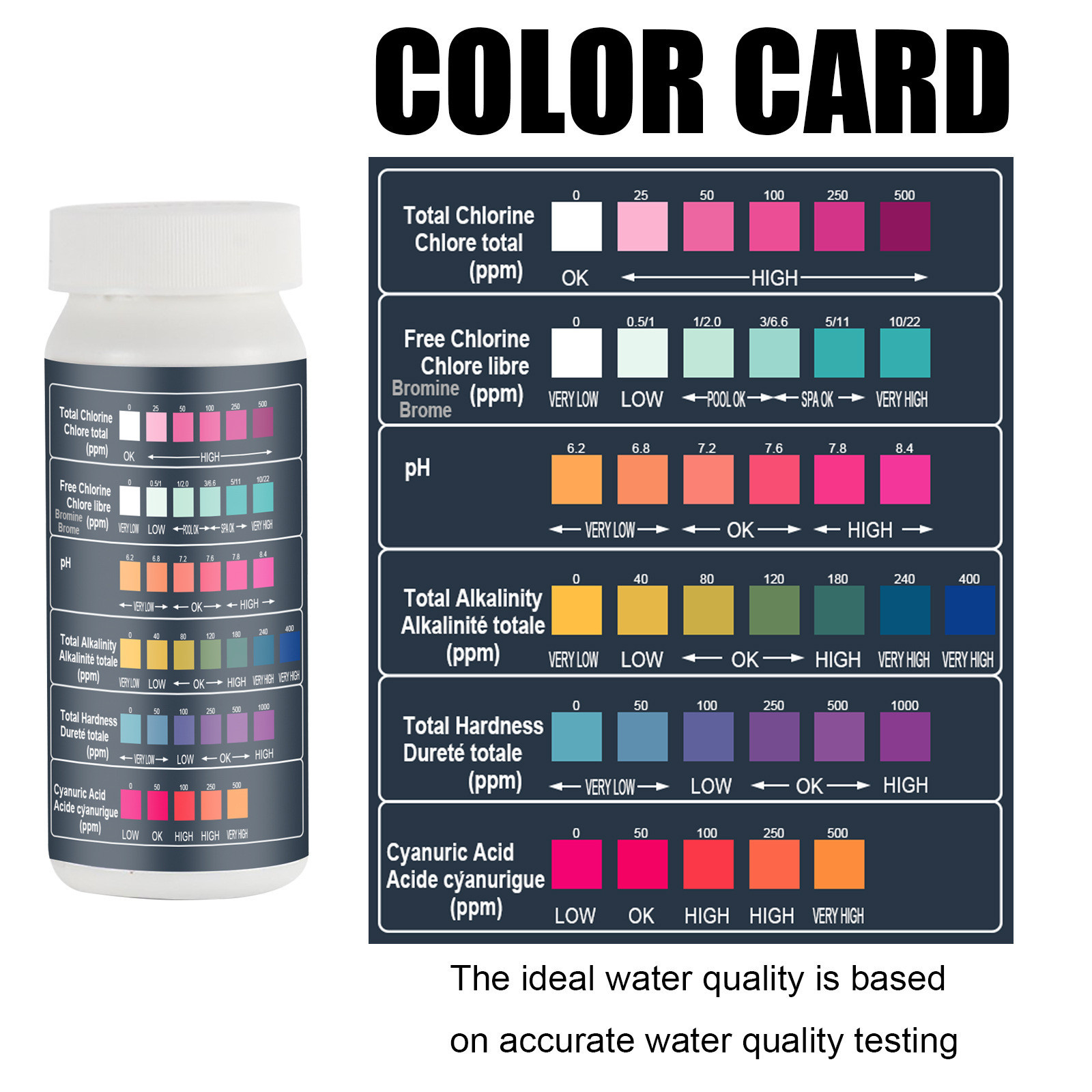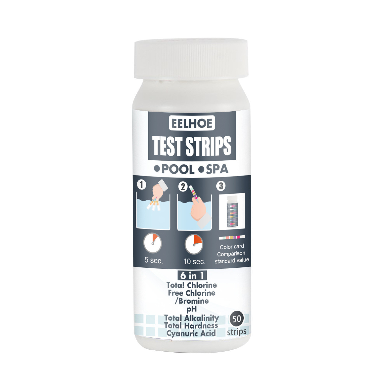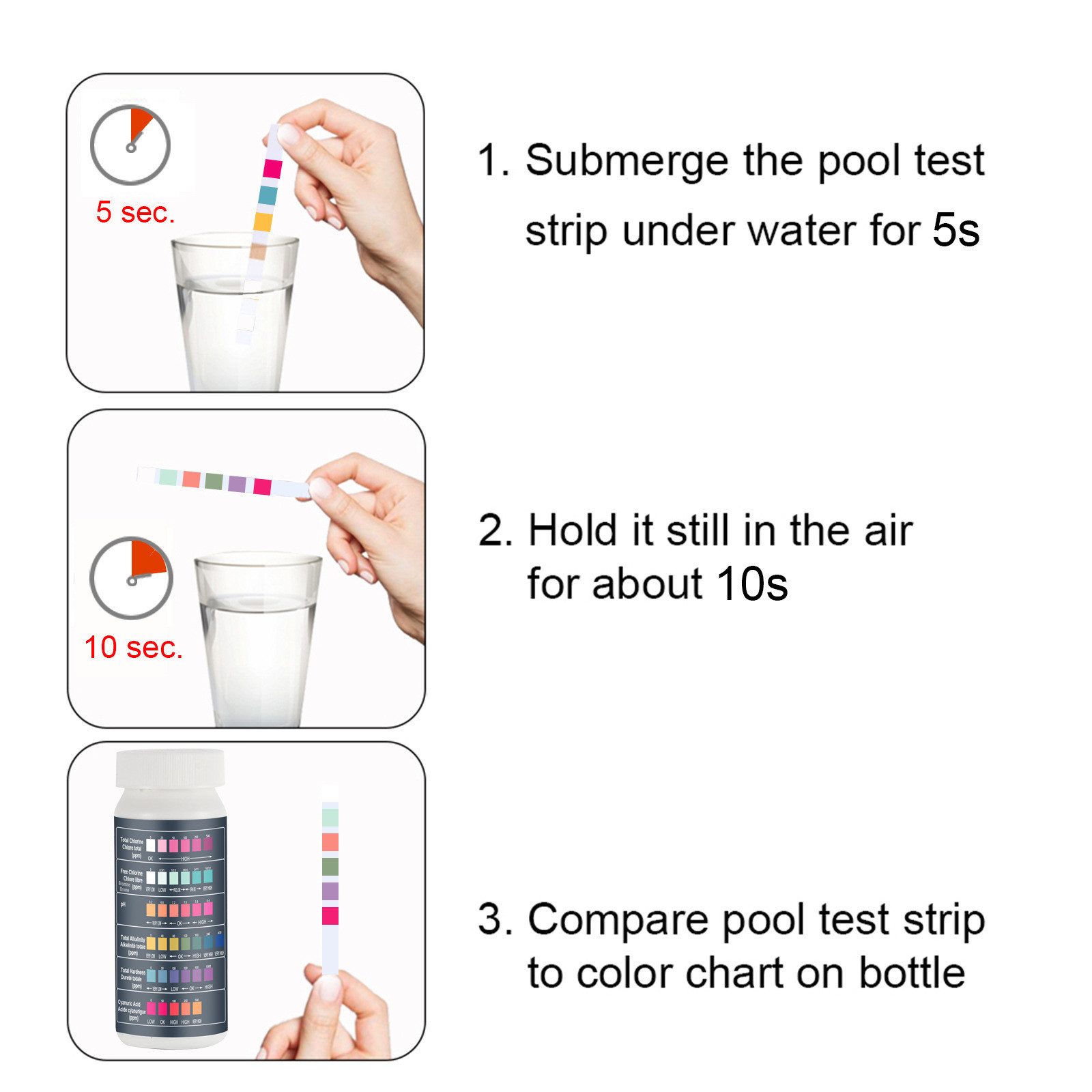 Тест-полоски для бассейна можно использовать для тестирования pH, общего хлора, свободного хлора, общей щелочности, цианурной кислоты, общей твердости и т. д., с большим количеством функций, которые другие тест-полоски и наборы для испытаний жидкости