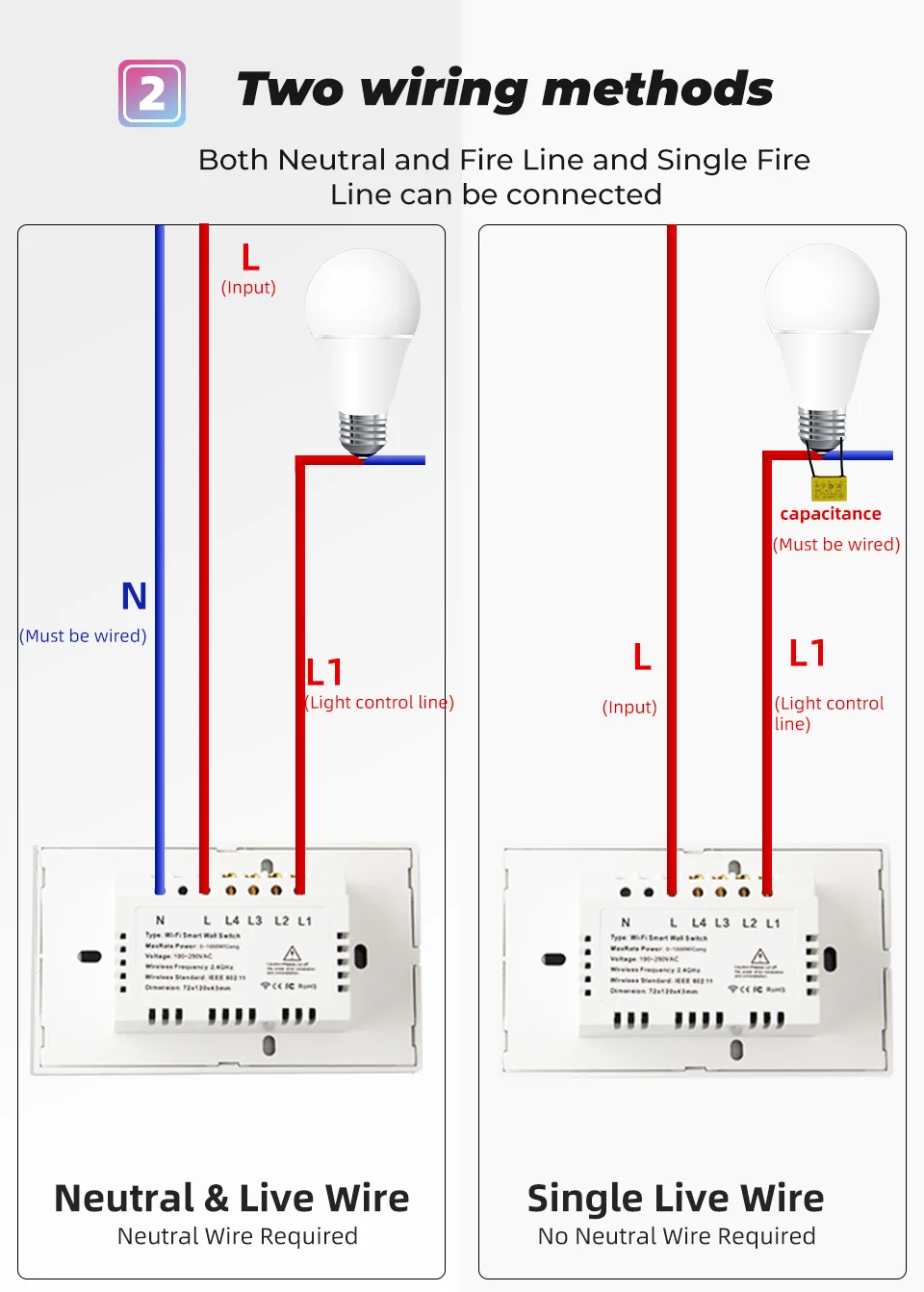 Для реализации функции двустороннего управления дом должен иметь нейтральную линию для достижения успеха. (Кроме того, вы должны подключиться к сети и открыть «мульти-контроль параллельно» в приложении, чтобы достичь 2 способа управления)