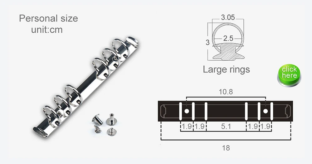 Высококачественные кольца, 6 отверстий, диаметр 25 мм, размер был показан на картинке. Это максимум для 160 листов личной бумаги 100 г. Эти кольца можно легко заменить, открыв винты.