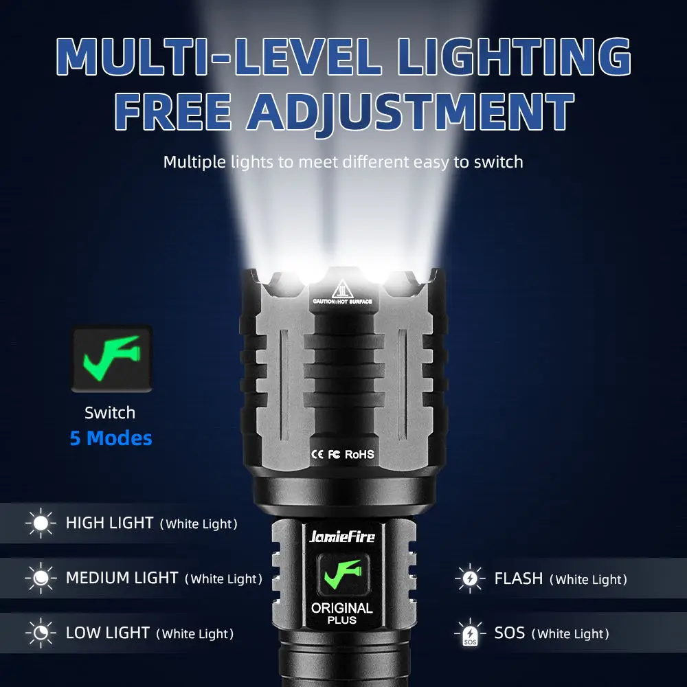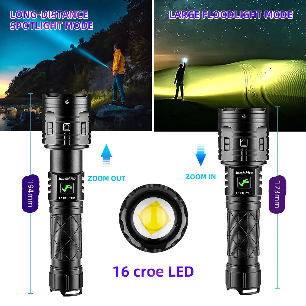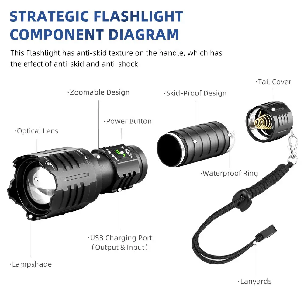 Новая быстрая зарядка через USB Type-c, функция отображения заряда батареи, увеличенная Выходная функция, может использоваться в качестве банка мощности для зарядки мобильных телефонов, увеличенных линз, более широкого диапазона освещения, добавлен молоток безопасности в задней части, который используется для аварийной ситуации. Противоскользящие линии корпуса трубки, напавшая на голову.