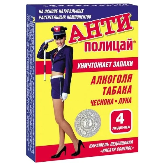 Антиполицай освежает дыхание, помогает избавиться от неприятных и зловонных запахов, вызванных сигаретами, алкоголем (причем речь идет как о свежем алкогольном «аромате», так и о перегаре) и остропахнущими продуктами, такими как лук, чеснок и др.