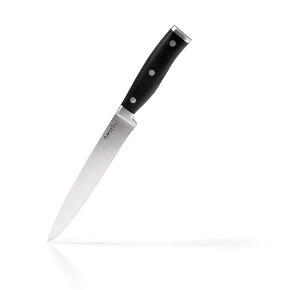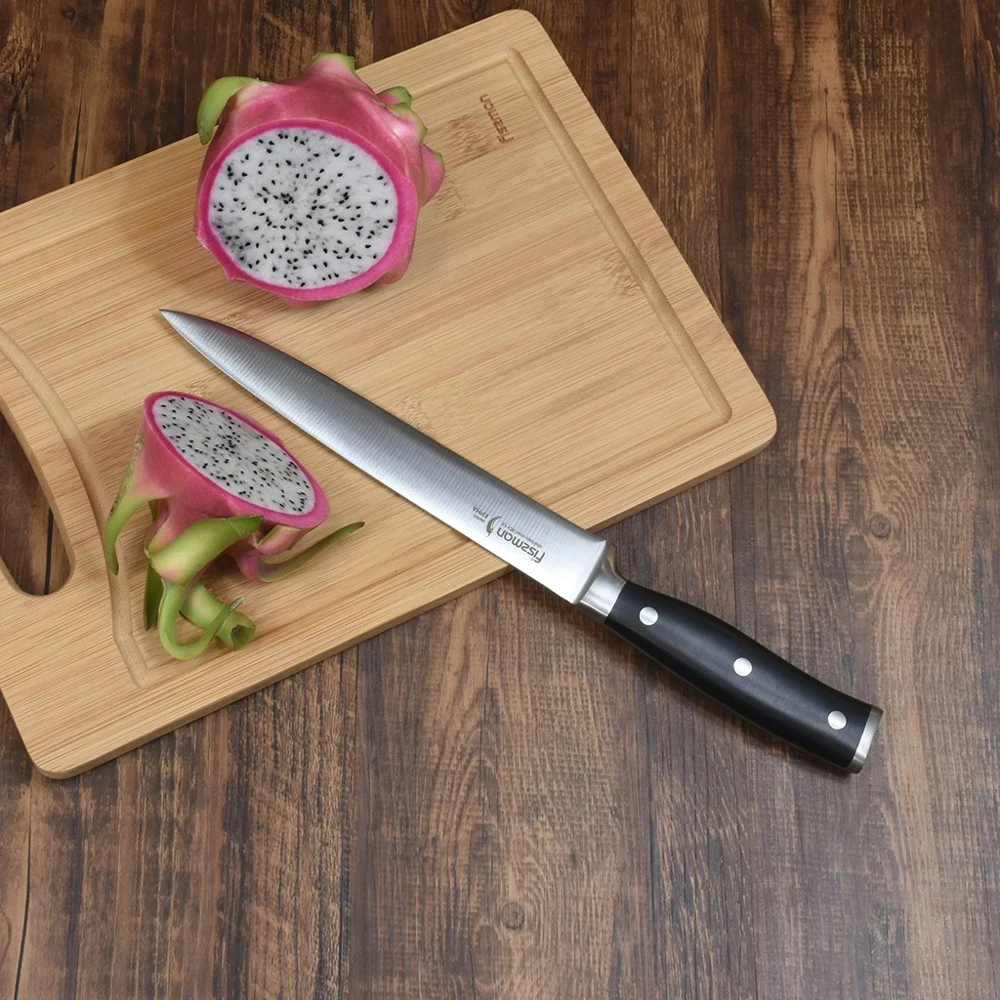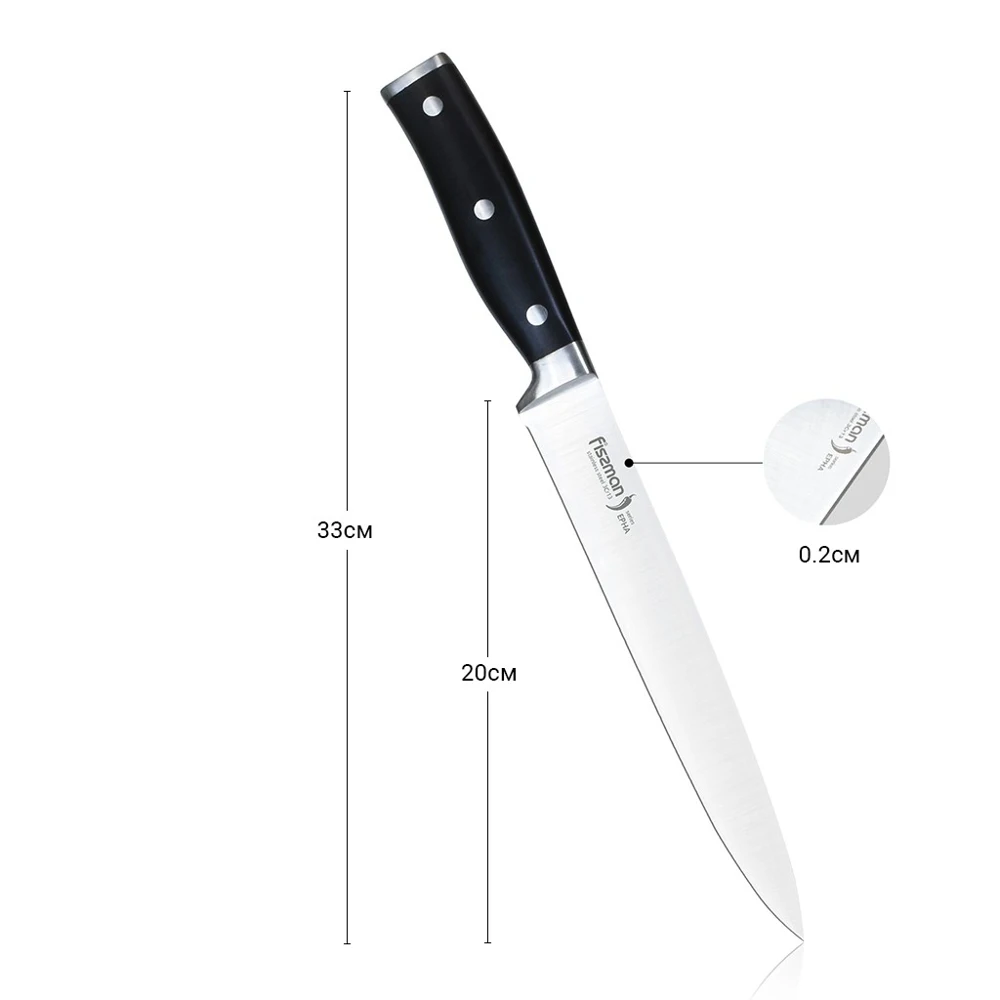 Гастрономический нож выбор знатоков. Он подойдет для нарезки любых продуктов на идеально тонкие кусочки благодаря длинному и узкому лезвию. Он пригодится и для приготовления блюд японской кухни – суши и сашими.Кухонные ножи серии EPHA изготовлены из стали 3Cr13, созданной азиатскими технологами. Металлургам удалось получить материал с отличными эксплуатационными характеристиками.К достоинствам ножей из 3Cr13 нужно отнести прочность, твердость, устойчивость к износу.Лезвия имеют двухстороннюю симметричную заточку по всей длине режущей кромки, что обеспечивает легкую нарезку и разделку.Утолщенная пята клинка предотвращает соскальзывание пальцев на лезвие и обеспечивает дополнительный упор во время работы.Каждая модель оснащена больстером из нержавеющей стали равномерно распределяющим нагрузку во время работы. Рукоятка из ABS-пластика прочно зафиксирована тремя болтами.Чтобы продлить срок службы ножа, его следует мыть вручную.