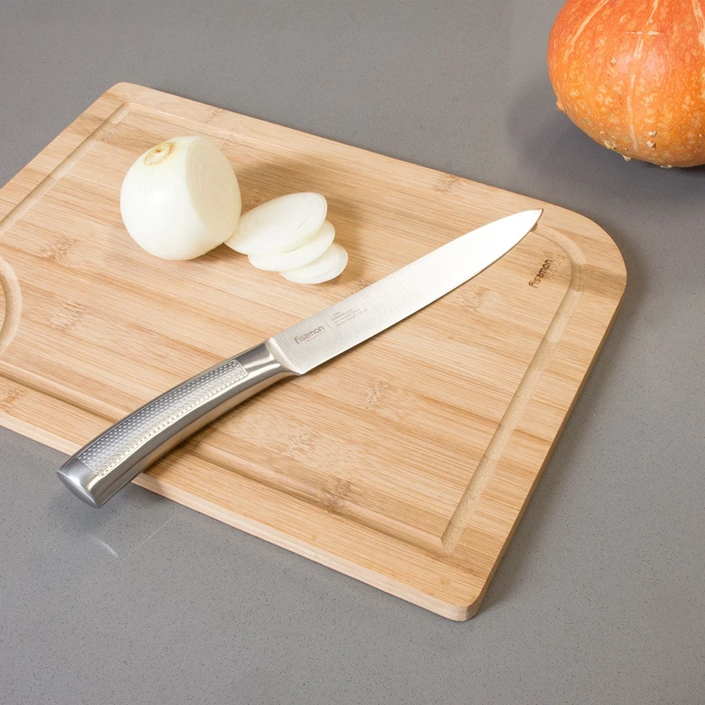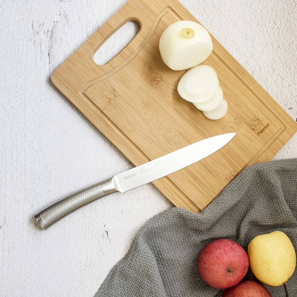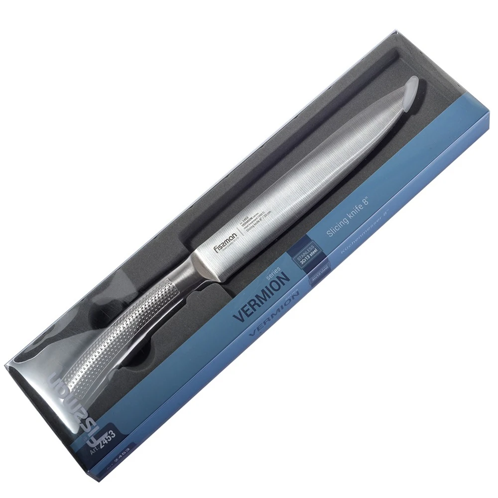 Гастрономический нож – выбор знатоков. Он подойдет для нарезки любых продуктов на идеально тонкие кусочки благодаря длинному и узкому лезвию. Он пригодится и для приготовления блюд японской кухни – суши и сашими.Ножи серии VERMION изготовлены из нержавеющей стали 3Cr13, созданной азиатскими технологами. Металлургам удалось получить материал с отличными эксплуатационными характеристиками.К достоинствам ножей из 3Cr13 нужно отнести прочность, твердость, устойчивость к износу.Лезвия имеют двухстороннюю симметричную заточку по всей длине режущей кромки, что обеспечивает легкую нарезку и разделку.Фактурная ручка из нержавеющей стали не скользит при нарезании, плотно ложась в руку.Точное бесшовное соединение клинка с рукояткой – залог высокой гигиеничности изделий.Неоспоримые плюсы таких изделий – эстетичный внешний вид и легкость.Чтобы продлить срок службы ножа, его следует мыть вручную.