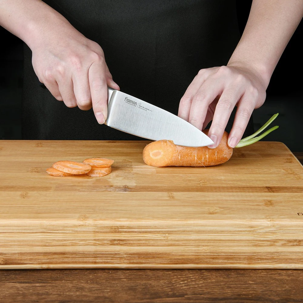 Поварской нож незаменимый помощник на кухне. Им можно нарезать филе, нашинковать овощи, разделать мясо. Им также легко давить чеснок и другие специи, отбивать заготовки для стейков или разбивать панцирь крабов.Кухонные ножи серии CHEF DE CUISINE изготовлены из стали 5Cr15MoV, закаленной до 57 единиц по шкале Роквелла. Они обладают повышенной прочностью и подходят для частого использования.Лезвия имеют двухстороннюю симметричную заточку по всей длине режущей кромки, что обеспечивает легкую нарезку и разделку.Утолщенная пята клинка предотвращает соскальзывание пальцев на лезвие и обеспечивает дополнительный упор во время работы.Каждая модель оснащена больстером из нержавеющей стали равномерно распределяющим нагрузку во время работы.Полипропиленовая рукоятка прочно зафиксирована тремя болтами. Она обладает повышенной комфортностью и не выскальзывает из рук при работе.Чтобы продлить срок службы ножа, его следует мыть вручную.