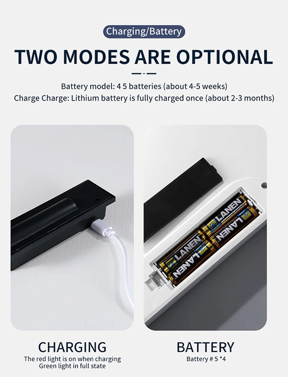 4. Доступны две спецификации, USB Перезаряжаемый Тип-литиевая батарея используется для приблизительно 2-3 месяцев, как только она полностью заряжена; Тип батареи-четыре батарейки AA используется для приблизительно 4-5 недель