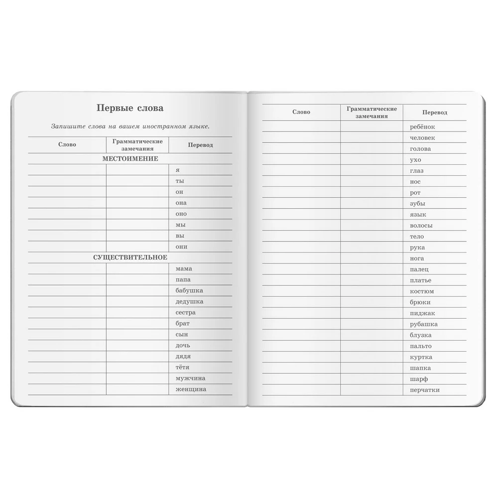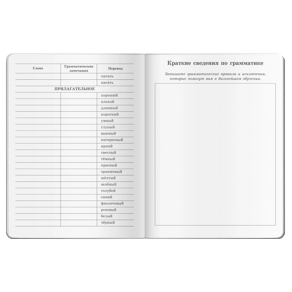 Тетрадь в привлекательной, яркой и прочной глянцевой обложке для записи слов при изучении любого иностранного языка. Страницы в клетку расчерчены на три колонки. Удобная разметка страницы в клетку позволяет записать несколько вариантов перевода и сопутствующую лексику (синонимы, антонимы и примеры употребления слова). В начале тетради есть место для самостоятельной записи алфавита и первых 170 слов на изучаемом языке. Пять чистых страниц выделены для записи необходимых грамматических правил и исключений. Тетрадь подходит для учащихся средней и старшей школы, а также студентам и взрослым. Формат 160х210 мм. Обложка глянцевая ламинированная. 64 страницы. В клетку. Крепление: скрепка.