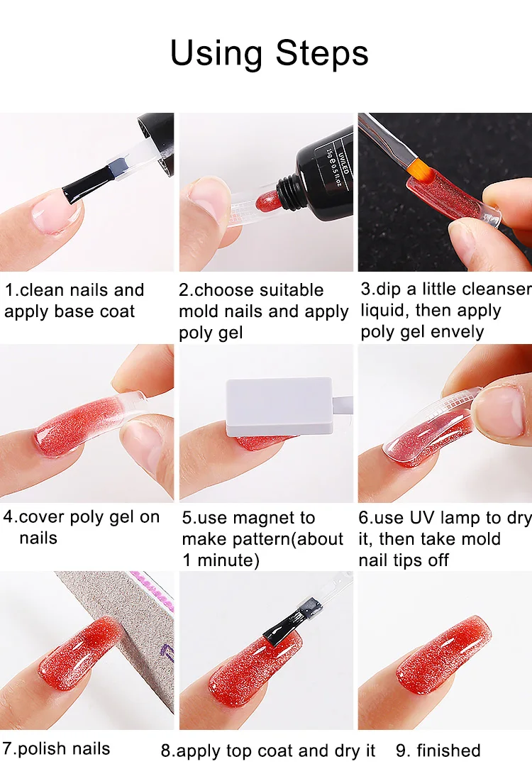 5. Нанесите поли гель для ногтей равномерно, наклейте его на ногти полностью и Используйте УФ/светодиодную лампу для сушки.
