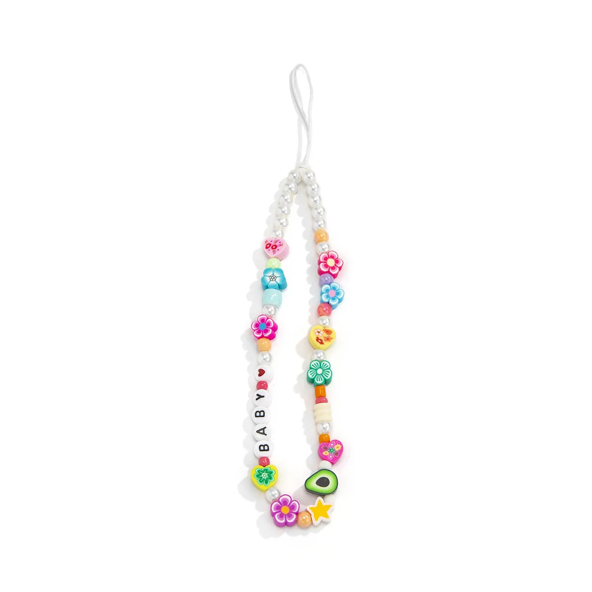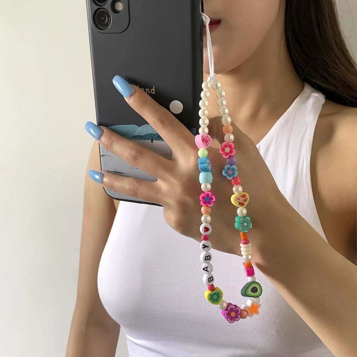 DIEZI Этническая многоцветная мягкая глиняная жемчужная цепочка для телефона с буквами, цветами, фруктовым сердцем, мобильная цепочка для телефона и ключей, ремешок