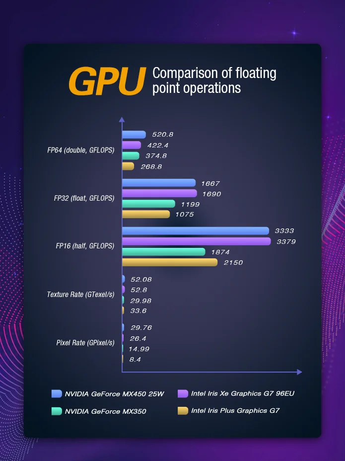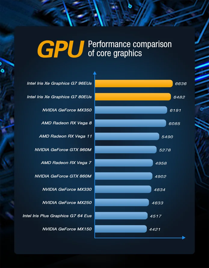Графическое ядро Intel lris Xe 12-го поколения, средний perl formance превосходит MX350 и даже превосходит MX450 при выполнении определенных задач