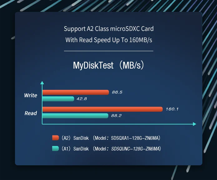 Поддержка номинальной карты A2 microSDXC, скорость чтения до 160 МБ/с.