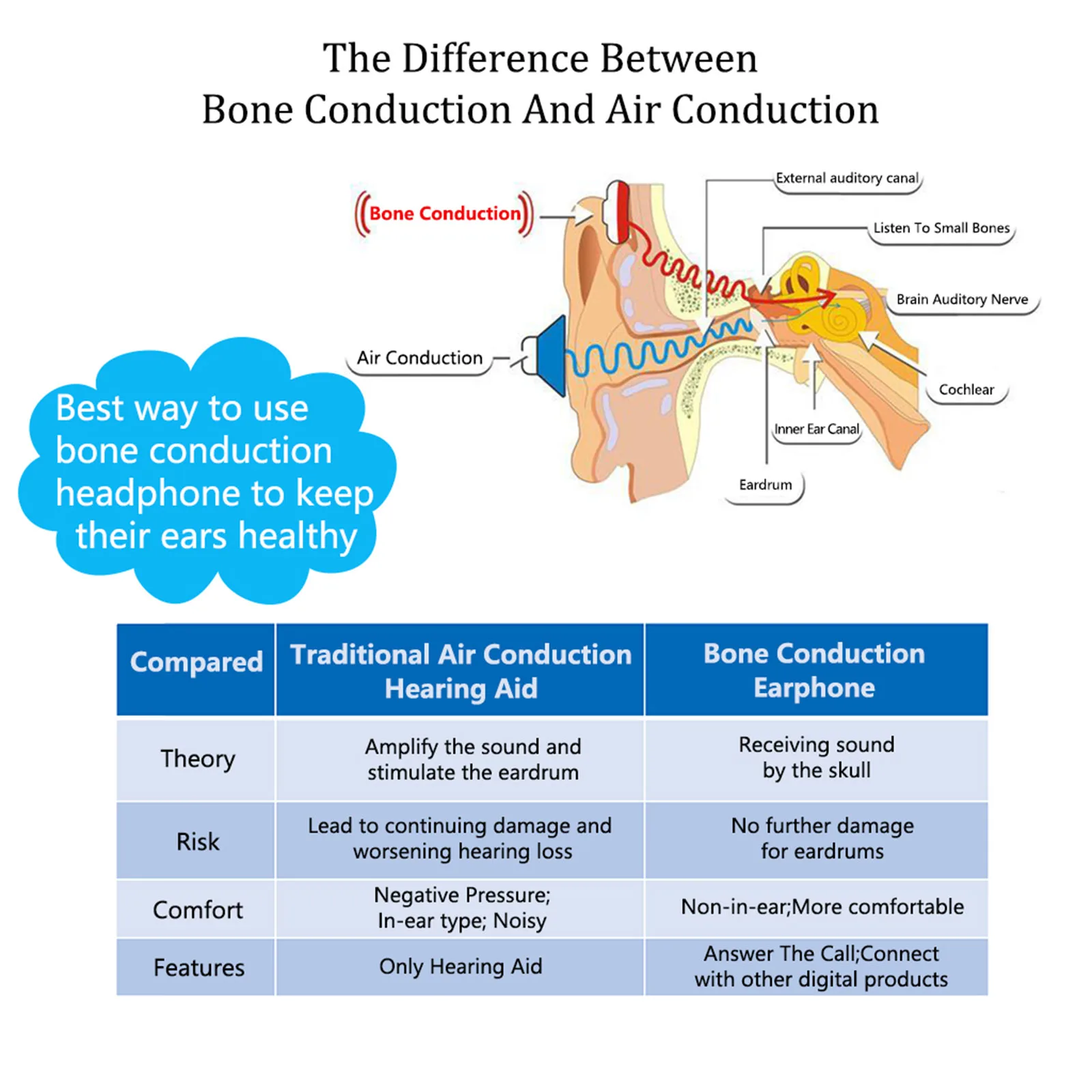 Звук передает через кость слуховой нерв, нет необходимости вставлять в ухо, нет повреждений барабанной перепонки, хорошо для пользователя, чтобы избежать болезни уха и потери слуха.